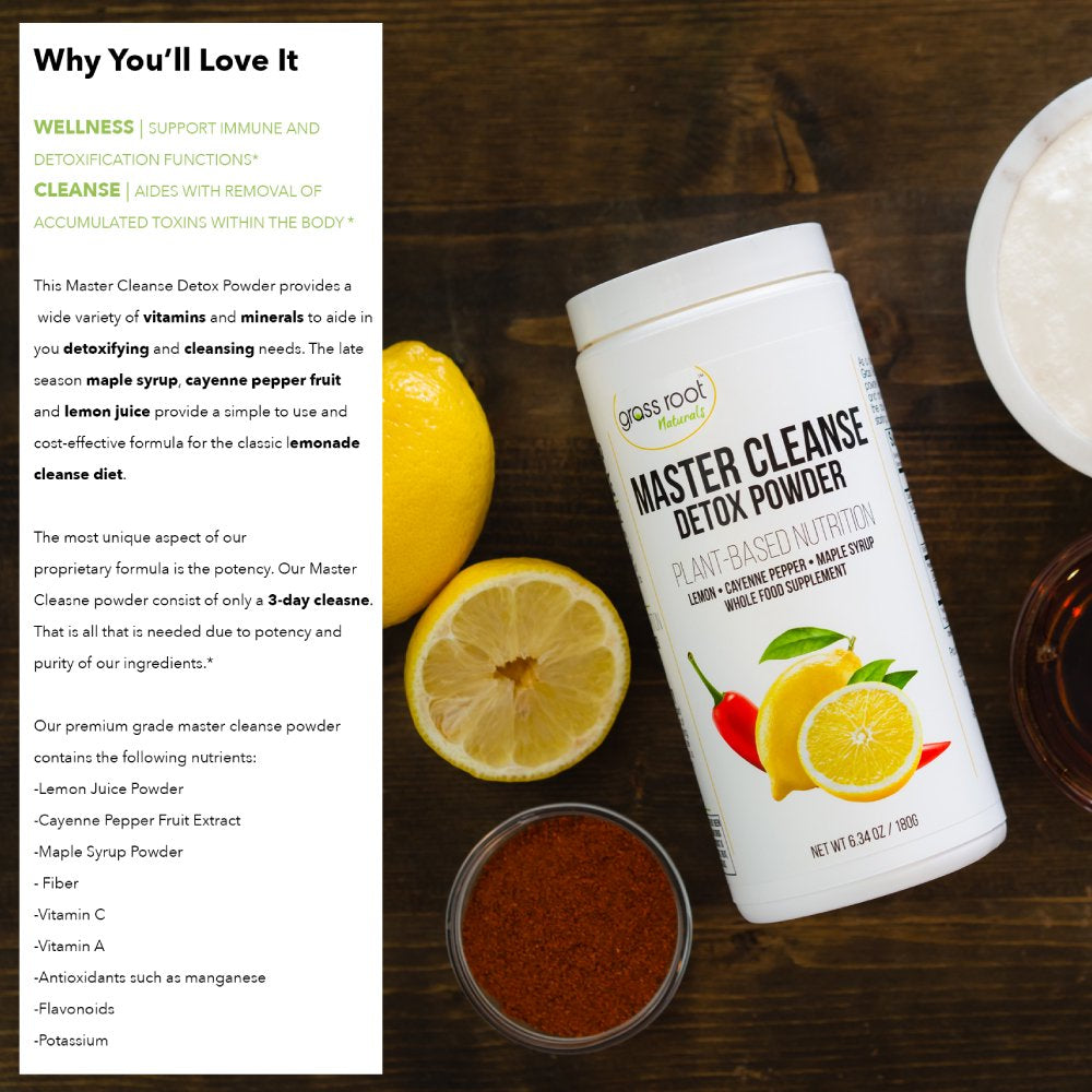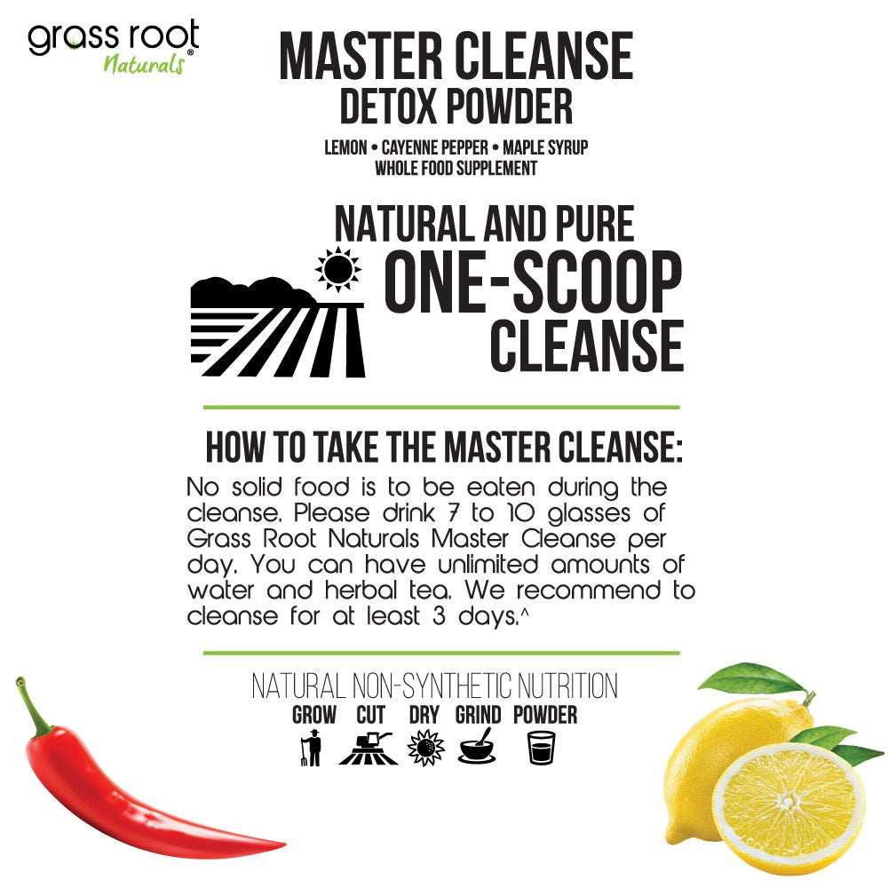 • Master Cleanse Lemonade Diet - This Grass Root master cleanse has antioxidant properties that may help detox and cleanse the body and improve energy levels. Thanks to its pure content of ingredients, this powder is easy to consume, which makes it a valuable and healthy addition to your diet.