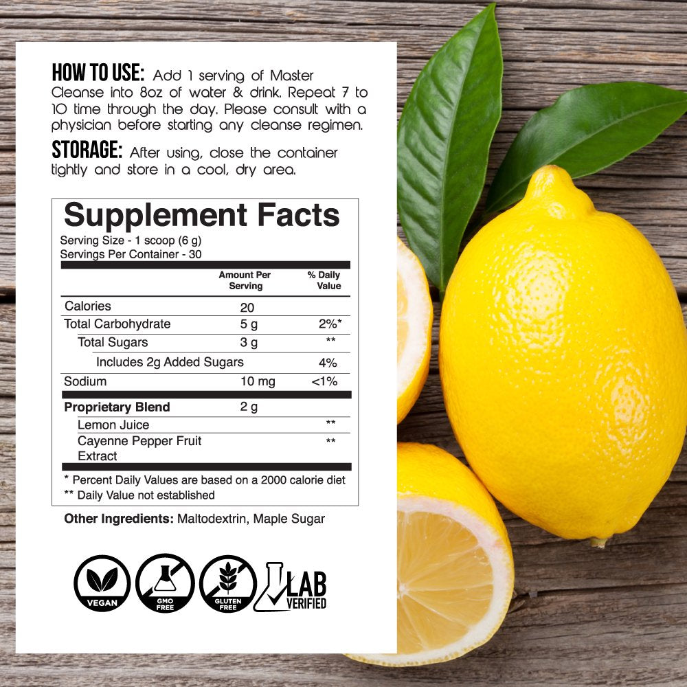 • Lemon Cayenne Cleanse - This Master Cleanse Fruit & Lemon Juice, Detox Powder is an easy to use and cost-effective formula for the classic lemonade cleanse diet. The proprietary formula delivers a wide variety of vitamins and minerals in a simple to use and cost-effective package.