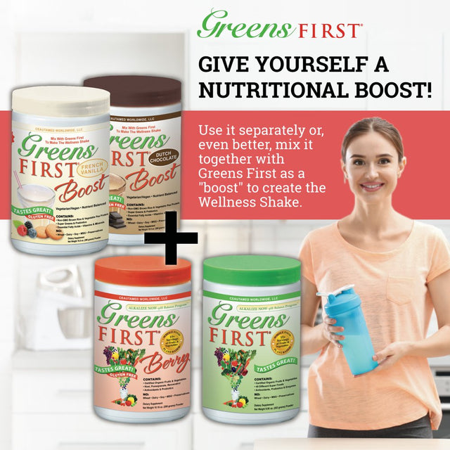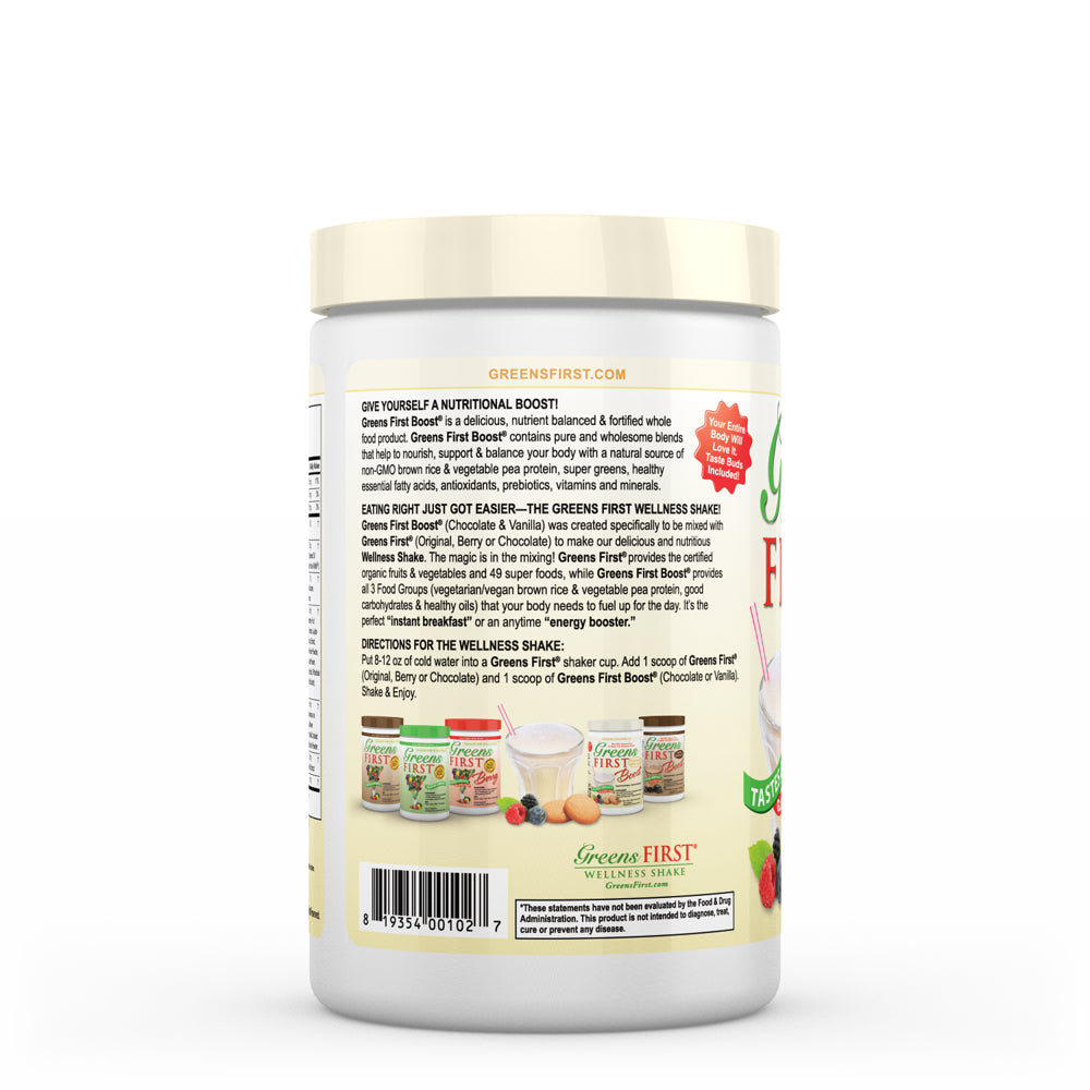 - GIVE YOURSELF A NUTRITIONAL BOOST!: Greens First Boost is a delicious, fast and easy to mix nutritional shake. The pure and wholesome blend nourishes, supports & balances your body with a natural source of non-GMO brown rice & vegetable pea protein, super greens, healthy essential fatty acids, antioxidants, prebiotics, vitamins and minerals.* Use it separately or, even better, mix it together with Greens First as a "boost" to create the Wellness Shake.
