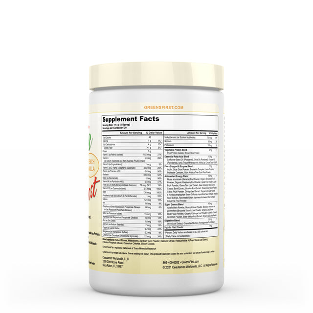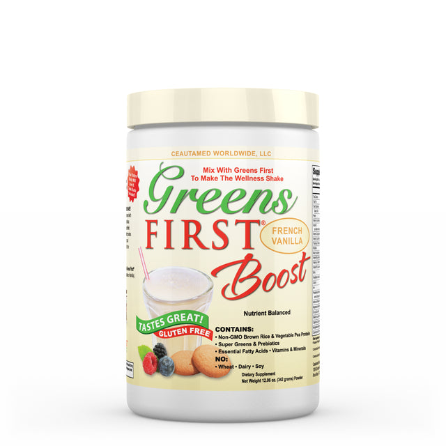 Greens First Boost Vanilla is a delicious, vegan nutrient balanced & fortified whole food product. It was specifically created to be mixed with Greens First (Original, Berry or Chocolate) as a nutritional boost to create the Wellness Shake. It is the perfect solution as an instant breakfast or anytime energy booster. Greens Boost Vanilla contains all 3 food groups, protein, good carbohydrates and healthy oils. It contains only the healthiest forms of protein for your body. Our source is 100% non-GMO Brown Rice & Vegetable Pea Protein. These are safe, pure and easily digestible forms of protein that are readily absorbed by the body. It also contains super greens, healthy essential fatty acids, antioxidants, prebiotics, vitamins and minerals. There is no dairy, soy, whey, aspartame, wheat, preservatives or added sugar. This pure and wholesome blend helps to nourish, support & balance your body. Greens First Boost comes in 2 delicious flavors, French Vanilla and Dutch Chocolate. Healthy never tasted so good!