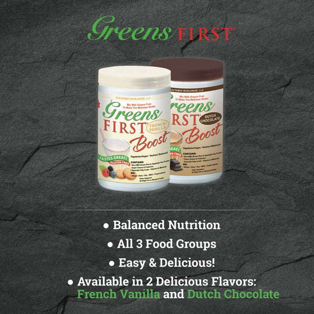 - EATING RIGHT JUST GOT EASIER!: Greens First Boost is your healthy and fast "super-food" that mixes into a delicious shake which provides all 3 Food Groups (vegetarian/vegan protein, good carbohydrates & healthy oils) that your body needs every day. This unique formula helps support overall wellness. Plant Based, Non-GMO Brown rice & Vegetable Pea Protein - Healthy Essential Fatty Acids - Antioxidants - Prebiotics - Vitamins and Minerals*