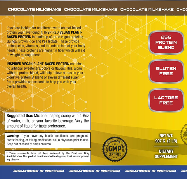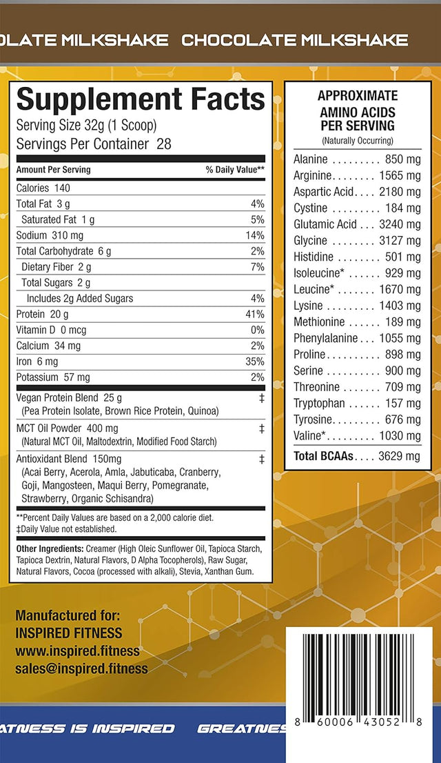 If you are looking for a great tasting alternative to animal-based protein you have found it! Inspired Vegan protein is made up of three vegan proteins Quinoa, Brown Rice and Pea Isolate. These provide amino acids, vitamins and minerals that your body needs. These proteins are higher in fiber which will aid in weight management. Inspired Vegan Protein contains no artificial sweeteners, colors or flavors. This along with the protein blend will help relieve stress on your digestive system. A blend of eleven different super fruits provides antioxidants to help you with your overall health and well being. Three sourced protein blend (Quinoa, Brown Rice and Pea Isolate) No artificial flavors, colors, or sweeteners. Sweetened with Stevia. 400mg MCT Oil Blend. 150mg Antioxidant Blend. Lactose and Gluten free. Easy on the digestive System. Real Chocolate Milkshake flavor. Mixes easily with no grainy taste. Made in the USA
