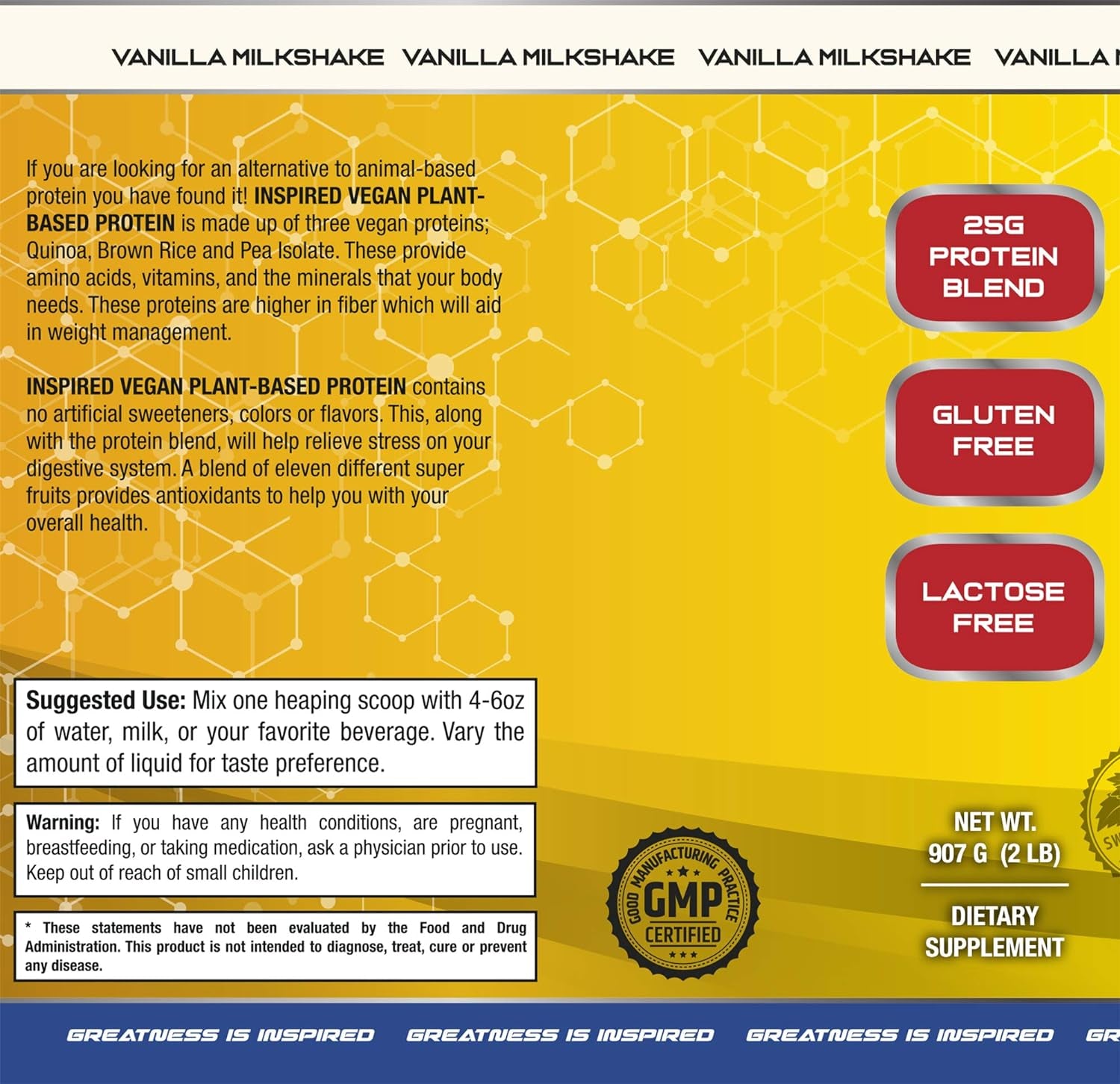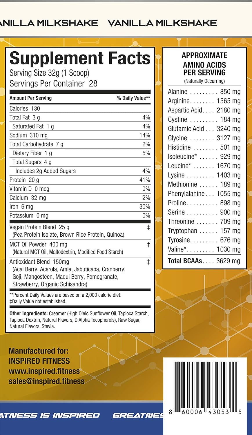 If you are looking for a great tasting alternative to animal-based protein you have found it! Inspired Vegan protein is made up of three vegan proteins Quinoa, Brown Rice and Pea Isolate. These provide amino acids, vitamins and minerals that your body needs. These proteins are higher in fiber which will aid in weight management. Inspired Vegan Protein contains no artificial sweeteners, colors or flavors. This along with the protein blend will help relieve stress on your digestive system. A blend of eleven different super fruits provides antioxidants to help you with your overall health and well being. Three sourced protein blend (Quinoa, Brown Rice and Pea Isolate) No artificial flavors, colors, or sweeteners. Sweetened with Stevia. 400mg MCT Oil Blend. 150mg Antioxidant Blend. Lactose and Gluten free. Easy on the digestive System. Real Vanilla Milkshake flavor. Mixes easily with no grainy taste. Made in the USA
