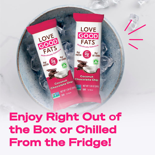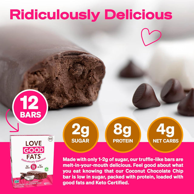 Love Good Fats Keto Bars, Truffle Coconut Chocolate Chip - Plant-Based Protein Snack, Low Carb, Low Sugar, Gluten Free, Non GMO, 12 Pack