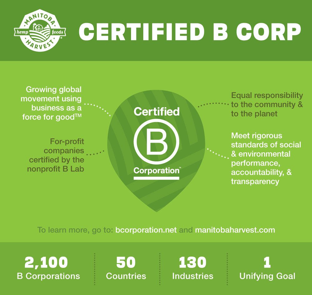 - STRONG VALUES: At Manitoba Harvest we believe in cultivating the world in which we want to live. As a Certified B-Corp with a net zero carbon footprint, sustainability is at the forefront of everything we do