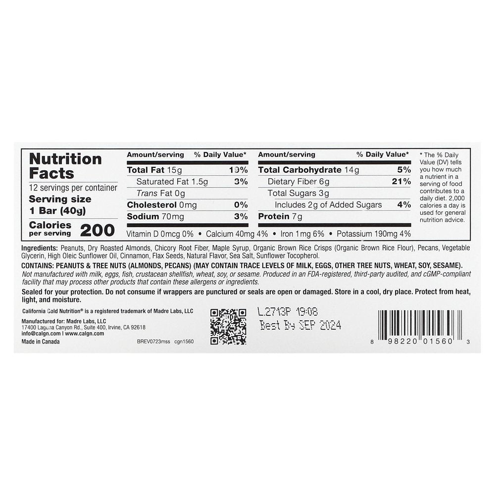 California Gold Nutrition® Maple Sea Salt Bars Made with Simple Ingredients: Peanuts, Roasted Almonds, Pecans, Flax Seeds, and Maple Syrup 6g of Fiber and 7g of Plant Based Protein Suitable for Vegetarians No Artificial Colors, Flavors, Sweeteners, or Preservatives Formulated without GMOs Produced in a 3rd Party Audited cGMP Registered (Certified) Facility 100% Gold Guarantee Finding satisfying nutritious snacks is no easy task. The snacks that taste good are often packed with artificial ingredients and sugar, leaving you feeling defeated. Our snack bars offer the perfect balance between healthy and tasty, making them the gold standard for snacking. The next time you’re craving a bite, be sure to reach for one of these delicious bars. California Gold Nutrition Foods Maple Sea Salt Bars are made with simple ingredients, like peanuts, roasted almonds, flax seeds, sea salt, and maple syrup, and they are naturally sweetened. Each bar is individually wrapped, making them perfect for on-the-go snacking anytime, anywhere.