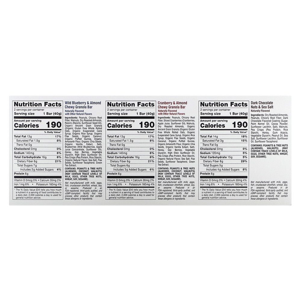 - Includes 6 Flavors: Wild Blueberry & Almond , Cranberry & Almond , Coconut Almond , Mocha Nut , Peanut & Dark Chocolate Chunk , Dark Chocolate, Nuts, & Sea Salt