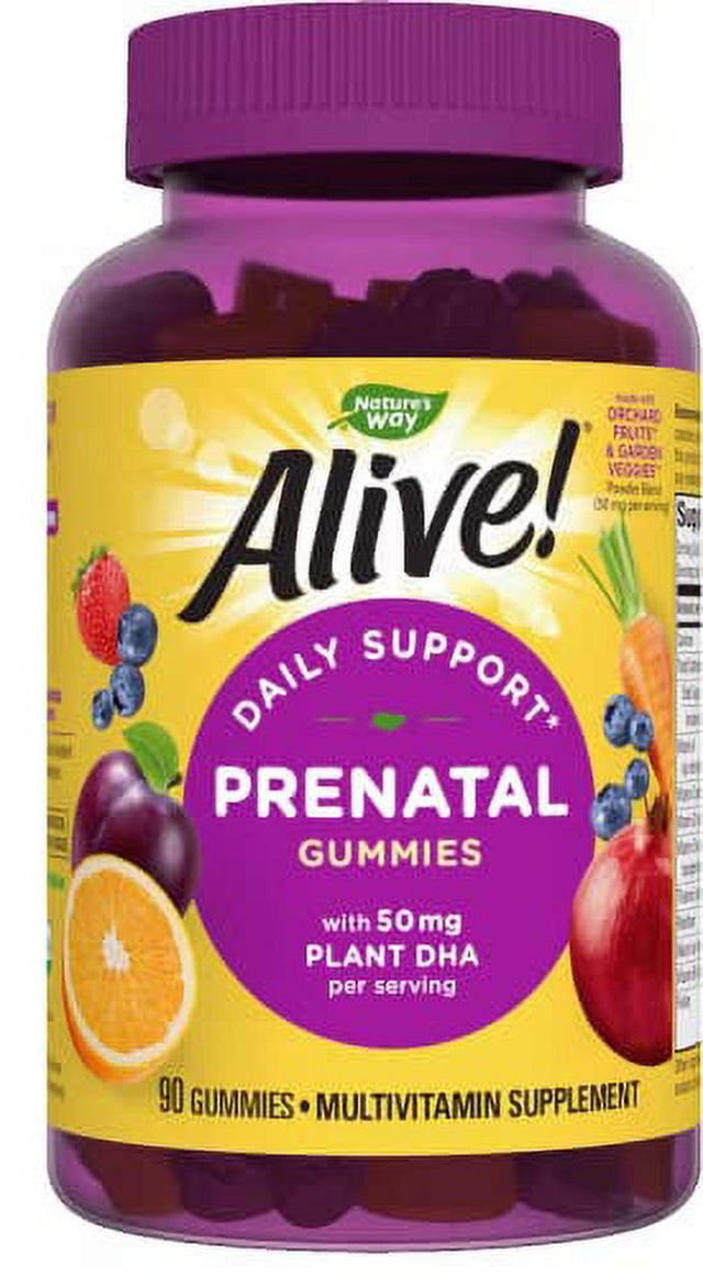 Nature’s Way Alive! Daily Support Prenatal Gummies, 50mg Plant-Based DHA per Serving, Vegetarian, 90 Gummies, Orange and Raspberry Lemonade Flavored