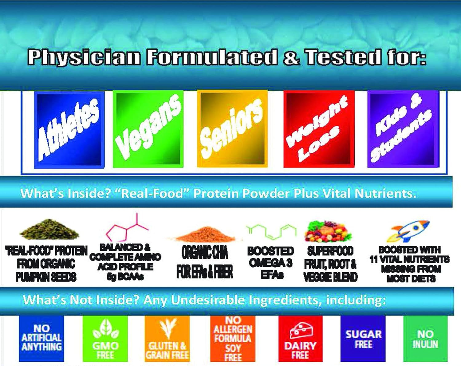 - PHYSICIAN FORMULATED VEGAN PROTEIN: Designed to be more Balanced and Complete than Meat. 11 Vital Nutrients that normally only occur in Meat (most are not in whey, milk or egg proteins either)