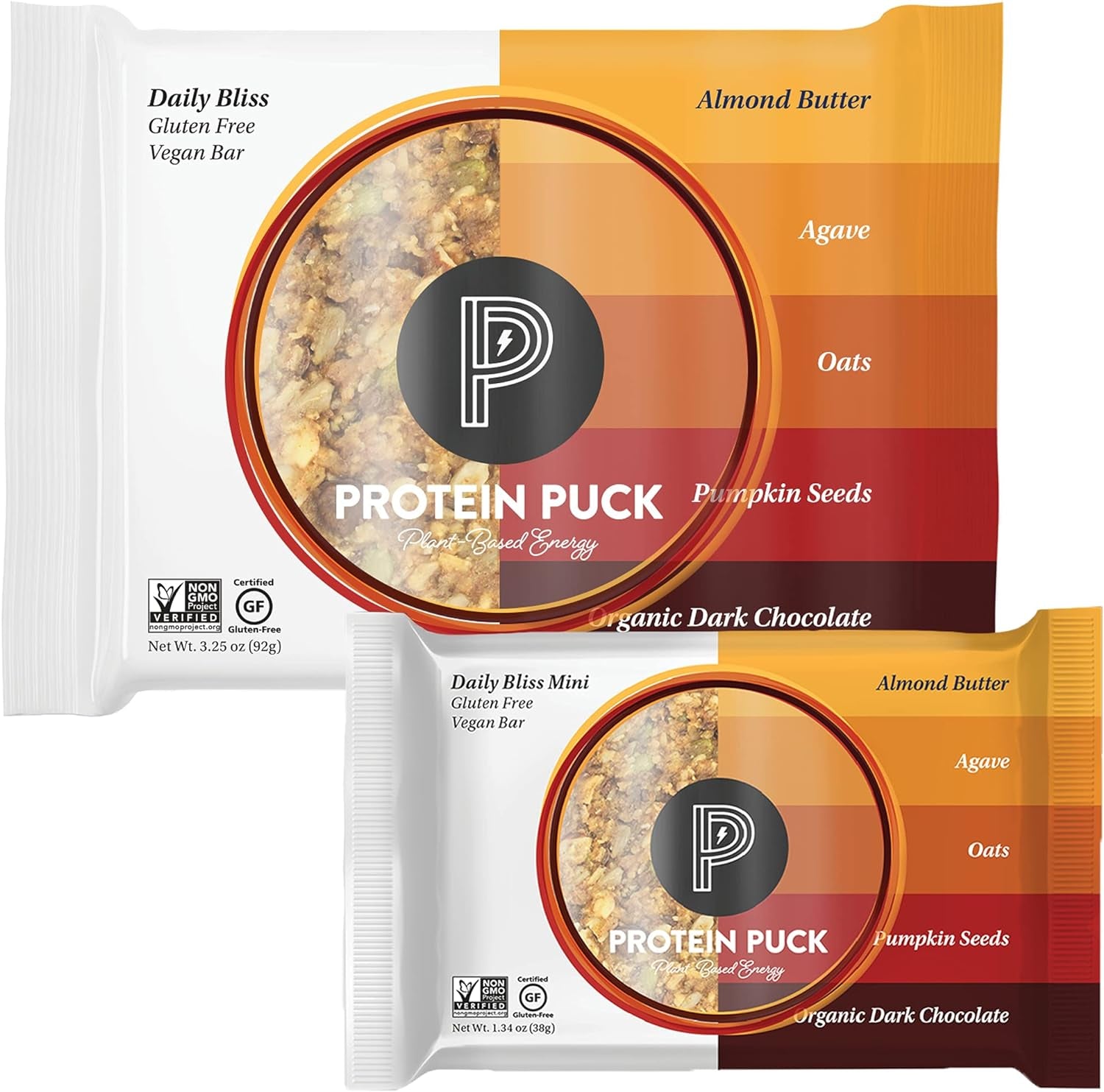 Protein Puck Value Bundle, Case of 12 Full Size Daily Bliss + Case of 16 Mini Daily Bliss - Plant-Based Bars, High Protein Snacks with Vegan Protein - Gluten-Free, Non-Dairy, Non-Gmo Snack Bar