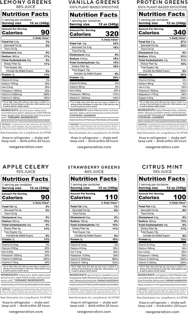 LOWER SUGAR, HIGHER PROTEINOur low-sugar detoxifying juice cleanse is the first step for resetting your diet and promoting a healthier lifestyle. The carefully selected ingredients are low in sugar and high in protein. Unlike other detox programs, our cleanse offers you the perfect balance of nutrients. With 47 grams of plant-based protein per day and 47% less sugar, you can be confident that you're nourishing your body while reducing your sugar intake. Each bottle is crafted with raw fruits, vegetables, nuts, and seeds, and contains no artificial ingredients, preservatives, or added sugars. With our cleanse, you can embrace a total diet reset without compromising on taste or nutritional value. | GENTLE DETOXEnjoy the benefits of gentle detoxification with the low-sugar cleanse. We have formulated it to support digestive health, remove toxic build-up in the gut, detoxify the liver, and gently cleanse the colon. Say goodbye to uncomfortable bloating without relying on harsh laxatives or experiencing the side effects often associated with detox pills and teas. Our cleanse is designed to promote healthy digestion, thanks to the inclusion of chlorophyll-rich raw leafy greens. These ingredients act as an effective prebiotic, helping to boost healthy bacteria while simultaneously eliminating harmful bacteria from the gut. By aiding digestion and optimizing nutrient absorption, our cleanse provides a natural and gentle detoxification experience that your body will appreciate. | FLASH FROZEN TO ENSURE FRESHNESSAt Raw Generation, we prioritize freshness and the preservation of vital nutrients in our low-sugar detoxifying juice cleanse. To ensure the utmost quality, we press the natural, organic ingredients and promptly flash-freeze them. This process helps retain the nutrients, enzymes, and flavors of the ingredients, so you can enjoy the full benefits of our cleanse. When you receive your order, the bottles will be delivered frozen, maintaining their optimal freshness during transit. Once thawed, simply keep them refrigerated and consume within 24 hours to experience the highest level of taste and nutrient content. Please note that orders may arrive earlier than the projected delivery date, ensuring that you can start your cleanse at your convenience and without delay. |