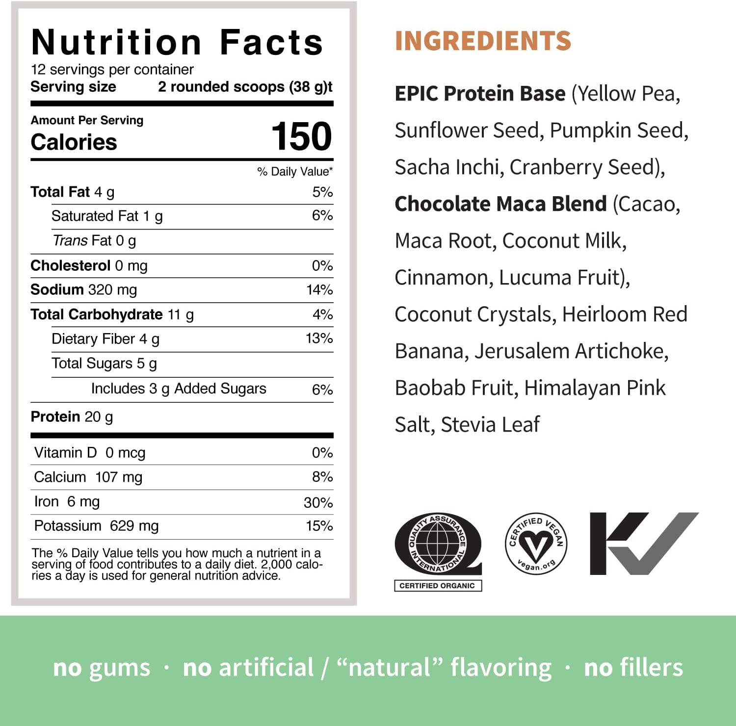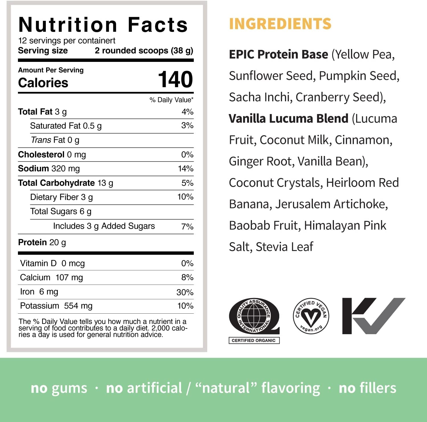 • COMPLETE PLANT PROTEIN - 20 grams per serving of complete vegan protein from five sources including Yellow Pea, Pumpkin Seed, Sunflower Seed, Sacha Inchi and Cranberry Seed.