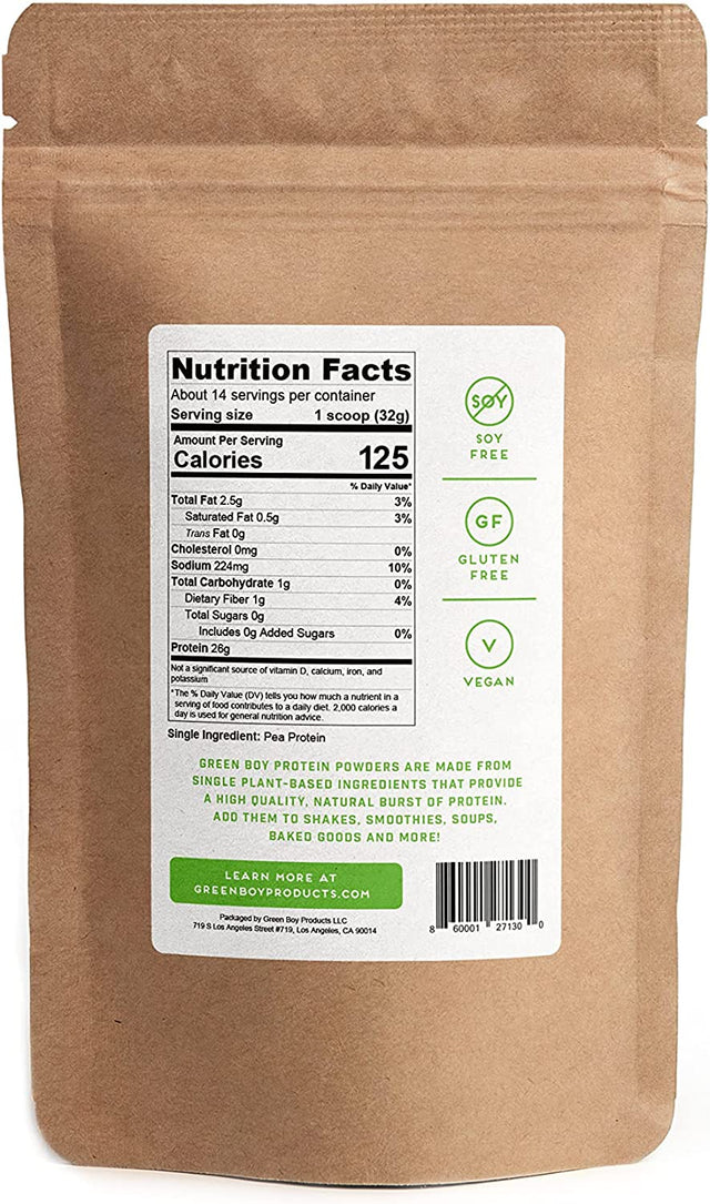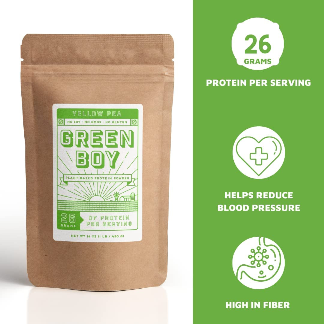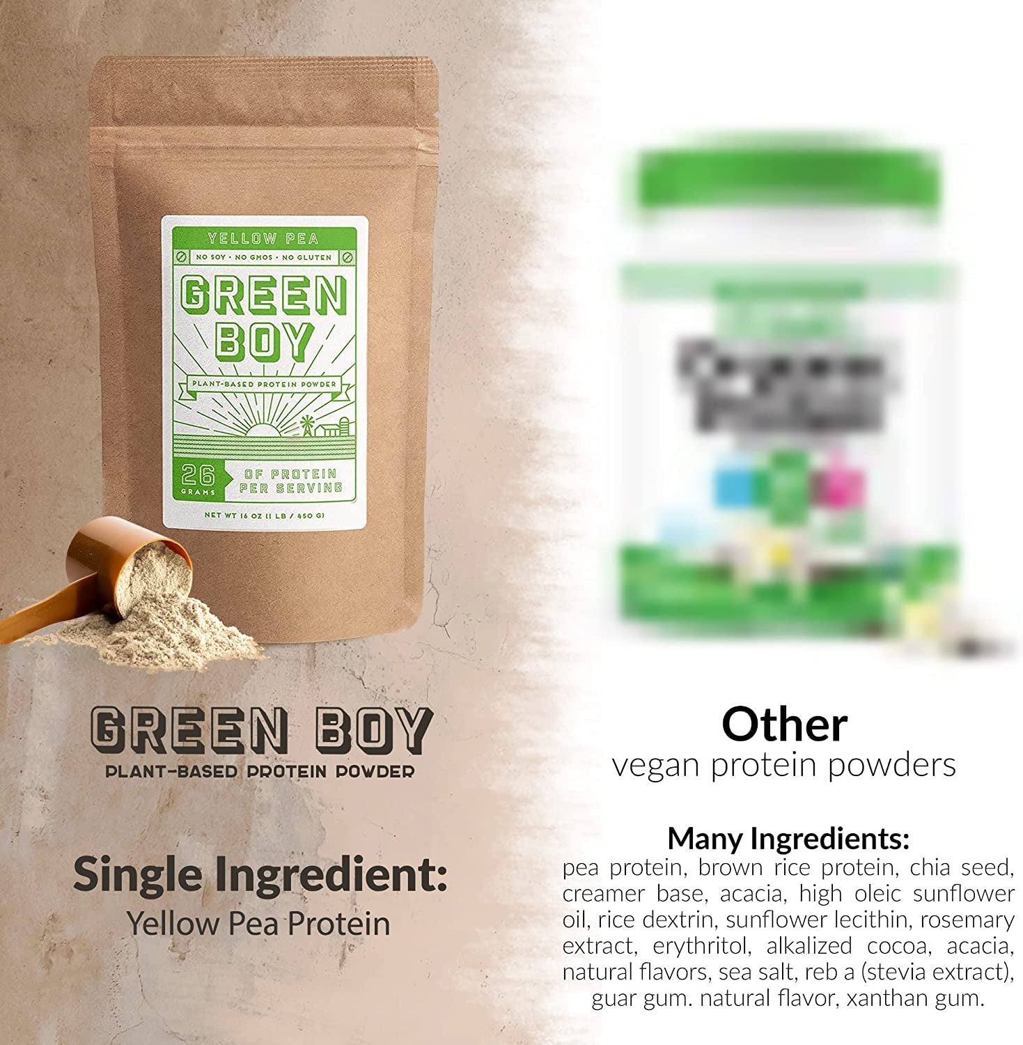 - CLEAN PLANT BASED PROTEIN: Green Boy yellow pea protein is completely plant-based and vegan, and doesn't contain common allergens such as soy, gluten or GMOs. In fact, it doesn't contain any added sugar. It's plant protein that's as clean and vegan as you can get.