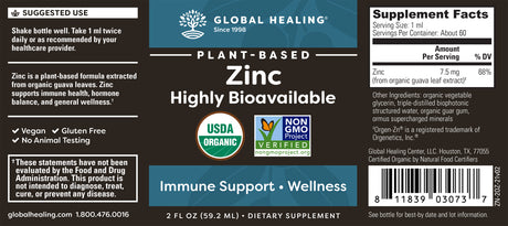 Global Healing Zinc, Organic Plant-Based Liquid Supplement for Immune Support, 2 Fl. Oz