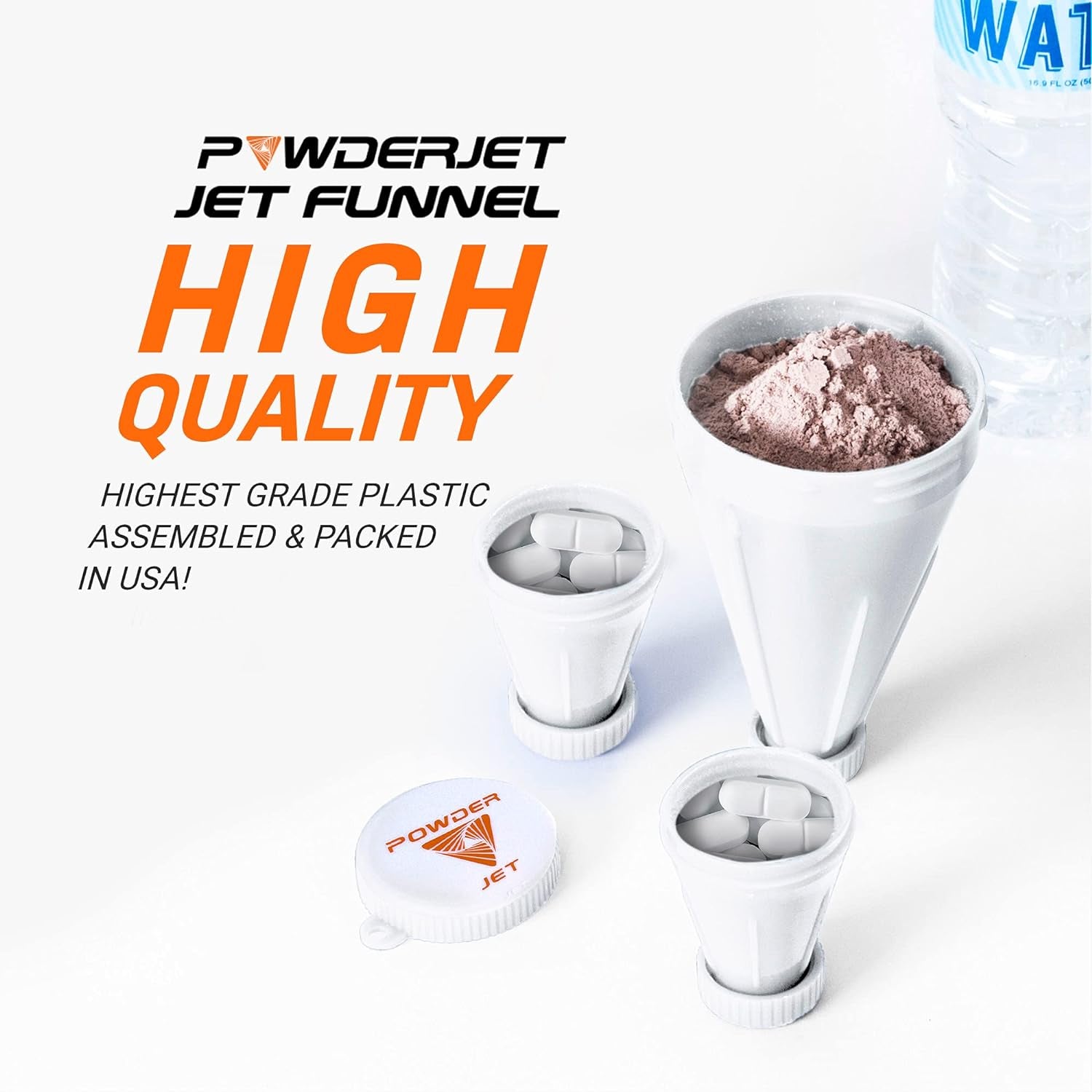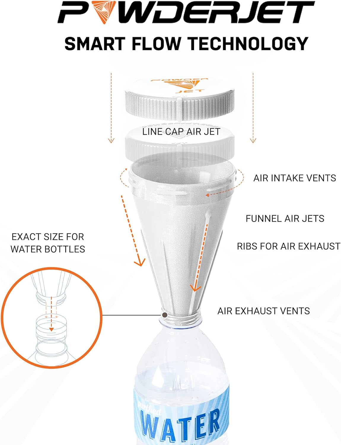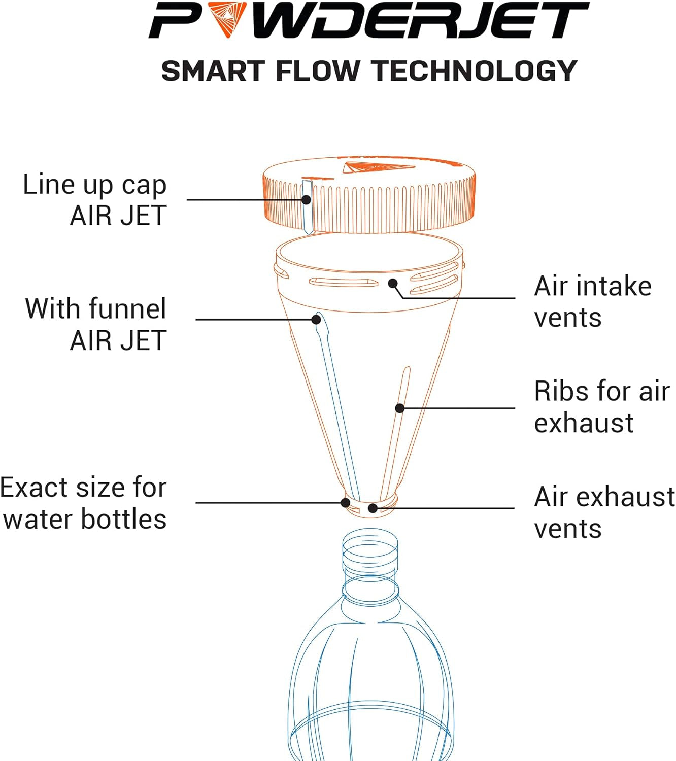 - NO MESS AND ZERO WASTED POWDER - PowderJet has a wide mouth for easy powder loading. It creates a snug fit in water bottle openings, so you don't need to hold the funnel when scooping powder into it. No mess and zero waste when loading and releasing powders into the water bottle!