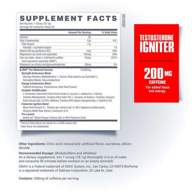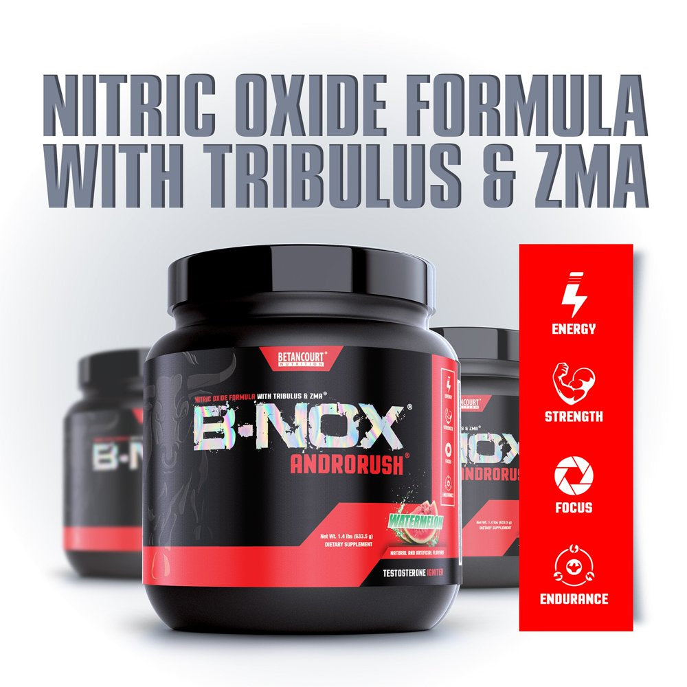 Turn up the intensity of your workouts with the original Pre-Workout Formula that shook the Industry two decades ago. Loaded with Tribulus, ZMA, Theobromine, Beet Root Powder, and 200MG of Caffeine - B-NOX Androrush from Betancourt Nutrition ignites your body's testosterone response to exercise while promoting Enhanced Strength, Improved Endurance, Energy Boost, and Laser Focus. B-NOX is the first pre-workout nitric oxide to offer a testosterone boosting blend promoted to enhance aggression and the pump during exercise in a delicious Watermelon flavor. For energy, B-NOX combines N-Acetyl Tyrosine, Glucuronolactone, Caffeine Anhydrous, and Theobromine for the ultimate, sustained energy rush with less chance of "crash" or "jitters". What you get is sustained energy during exercise, peak performance, and mind-muscle connection to maximize your workout
