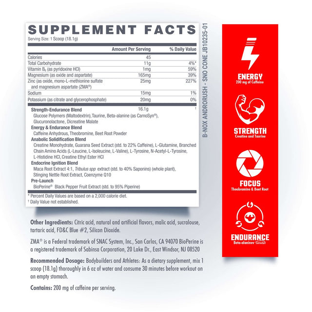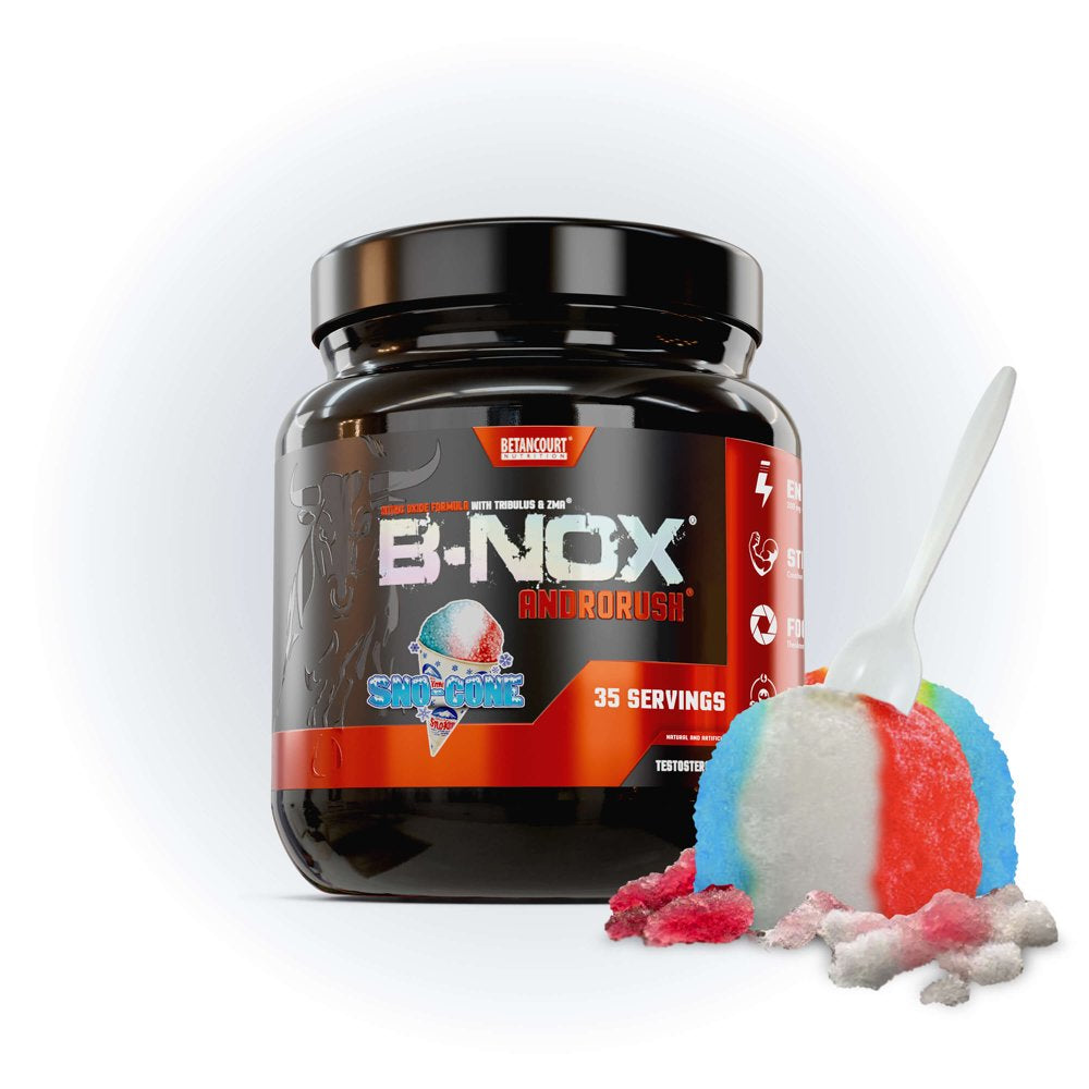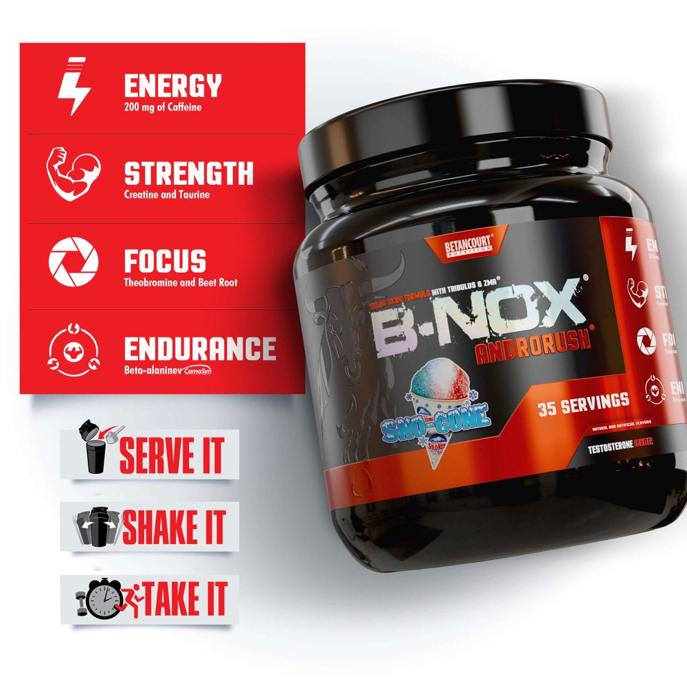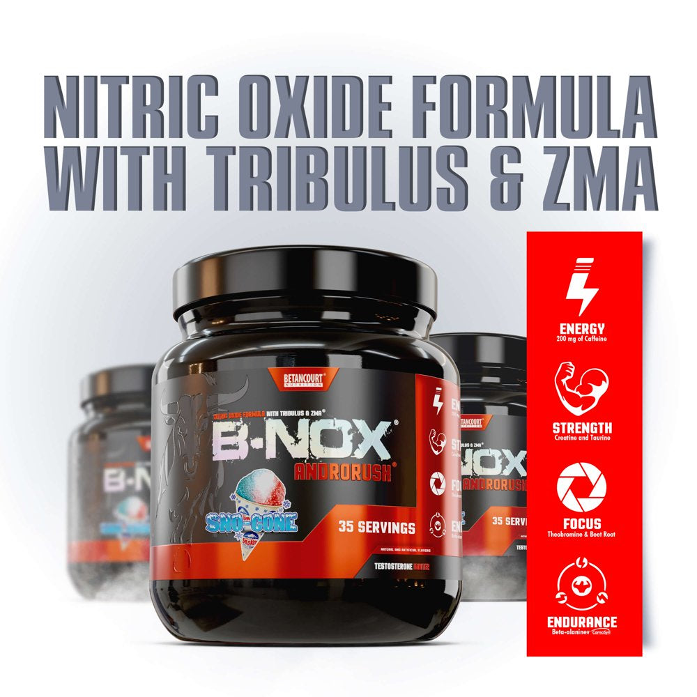 Turn up the intensity of your workouts with the original Pre-Workout Formula that shook the Industry two decades ago. Loaded with Tribulus, ZMA, Theobromine, Beet Root Powder, and 200MG of Caffeine - B-NOX Androrush from Betancourt Nutrition ignites your body's testosterone response to exercise while promoting Enhanced Strength, Improved Endurance, Energy Boost, and Laser Focus. B-NOX is the first pre-workout nitric oxide to offer a testosterone boosting blend promoted to enhance aggression and the pump during exercise in a delicious Sno-Cone flavor. For energy, B-NOX combines N-Acetyl Tyrosine, Glucuronolactone, Caffeine Anhydrous, and Theobromine for the ultimate, sustained energy rush with less chance of "crash" or "jitters".