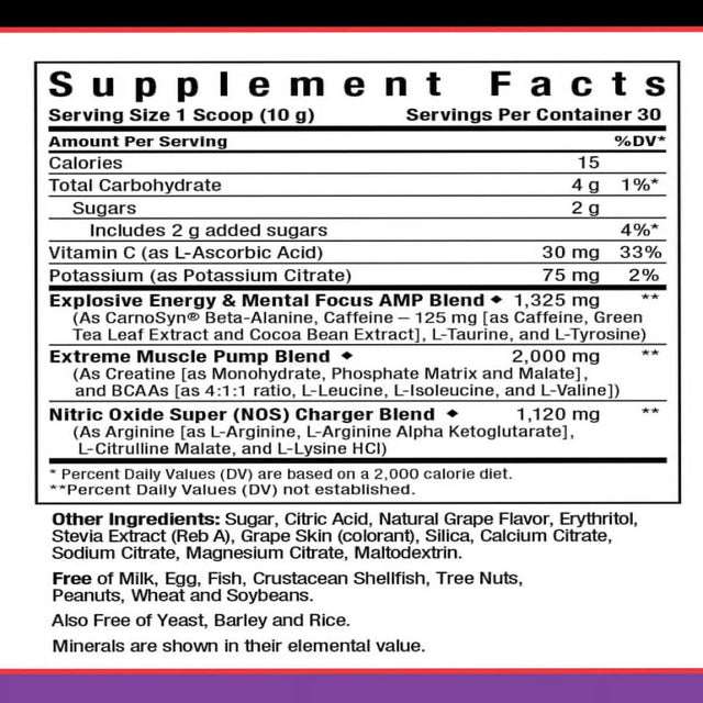 Extreme Edge Pre Workoit Strawberry Kiwi Flavor 1.32 lb LiquidProduct DescriptionExtreme Edge Pre Workout provides the cleanest, most intense muscle-recharging stack available. Other formulas dont come close to matching the potency and quality of this triple-turbo, super-charged formula. Extreme Edge Pre Workout ignites explosive energy and sharpens mental focus by exploiting the proven power of CarnoSyn, the patented and most studied form of beta-alanine, to increase the concentration of carnosine in the muscles, preparing them for extreme performance while decreasing fatigue. Fierce, free-form amino acids L-taurine and L-tyrosine and responsible levels of caffeine from natural sources ensure explosive energy at the start of a workout without causing the athlete to crash later.Supplement FactsServing Size 1 Scoop 10 g Amount Per Serving% Daily Value***Calories 15 Total Carbohydrates 4 g 1 Sugars 2 g Vitamin C as L-Ascorbic Acid 30 mg 50 Potassium as Potassium Citrate 75 mg 2 Explosive Energy & Mental Focus AMP Stack CarnoSyn Beta-Alanine, Caffeine 125 mg as Caffeine, Green Tea Leaf Extract and Cocoa Bean Extract, L-Taurine, and L-Tyrosine 1.325 mg *Extreme Muscle Pump Stack Creatine as Creatine Monohydrate, Creatine Phosphate Matrix and Creatine Malate, and BCAAs as 411 ratio, L-Leucine, L-Isoleucine and L-Valine 2,000 mg * Nitric Oxide Super NOS Charger Stack Arginine as L-Arginine, L-Arginine Alpha Ketoglutarate, L-Citrulline Malate, and L-Lysine HCl 1,120 mg * *Daily Value Not Established***Percent Daily Values are based on a 2,000 calorie dietOther Ingredients Sucrose, Citric Acid, Natural Flavors Grape or Lemon , Erythritol, Maltodextrin, Stevia