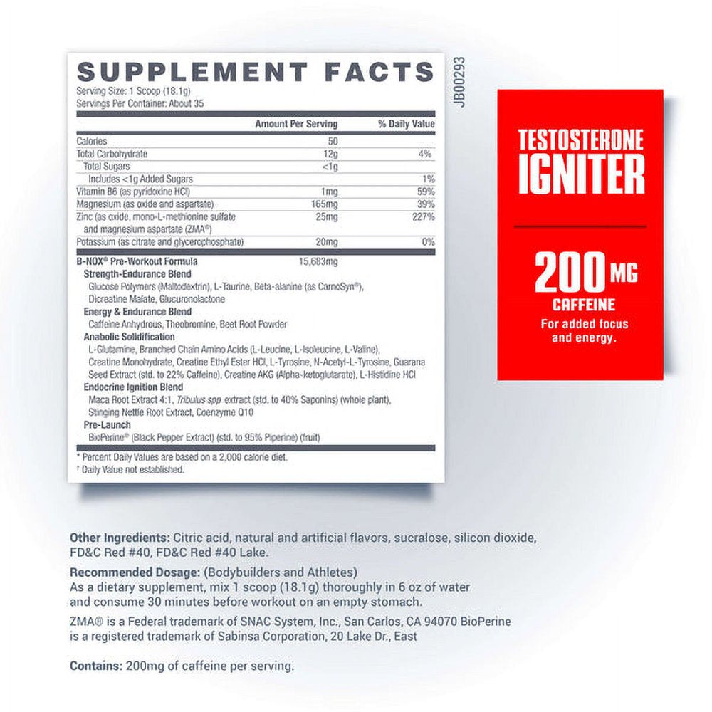 The pre-workout category has recently divided into two major classes: the concentrated pre-workout, and the larger serving performance based pre-workout. With both categories you'll find the ingredients between the competition to be similar, if not identical. So if a customer asks for something new or complains of a tolerance buildup to stimulants; what new innovation can you really offer them? B-NOX is the first pre-workout nitric oxide to offer a testosterone boosting blend promoted to enhance aggression and the pump during exercise. For energy, B-X combines N-Acetyl Tyrosine, Glucuronolactone, Caffeine Anhydrous, and Theobromine for the ultimate, sustained energy rush with less chance of "crash" or "jitters".