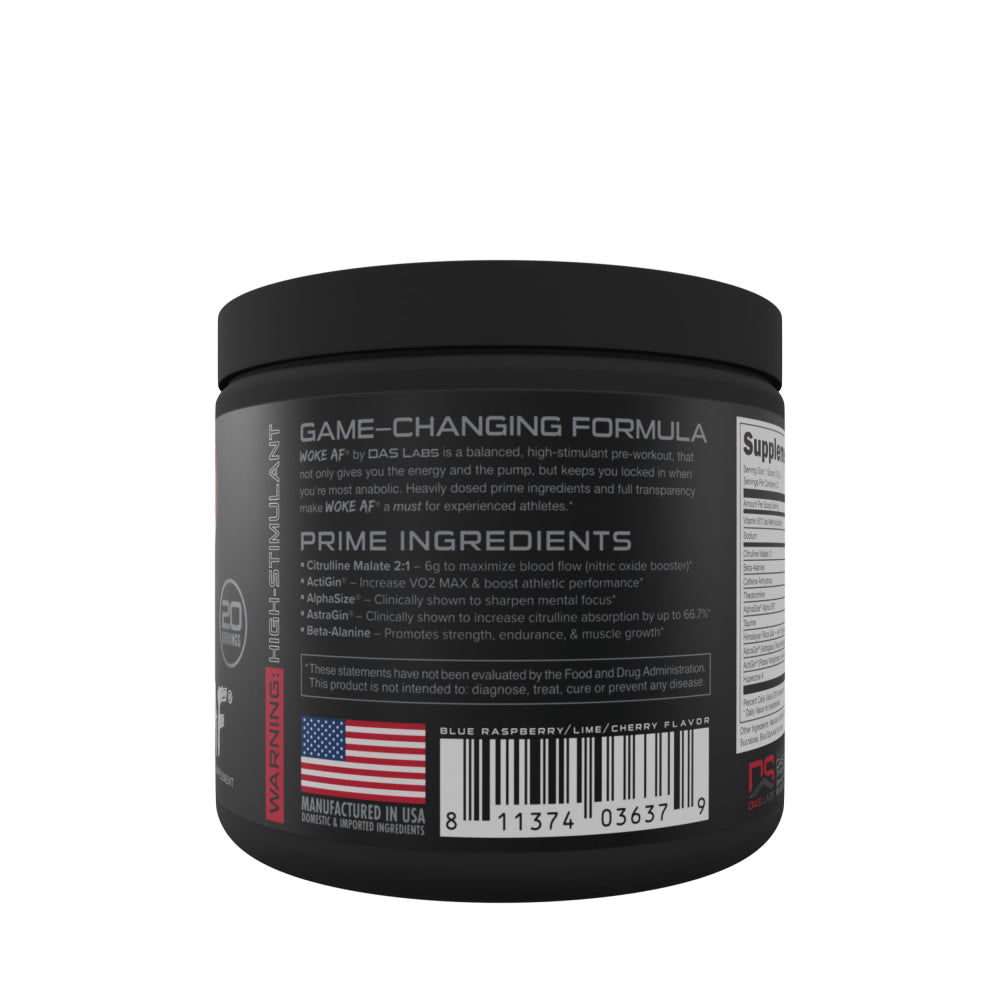 Woke AF is a balanced, high-stimulant pre-workout, that not only gives you the energy and the pump, but keeps you locked in when you're most anabolic. Heavily dosed prime ingredients and full transparency make WOKE AF a must for experienced athletes.