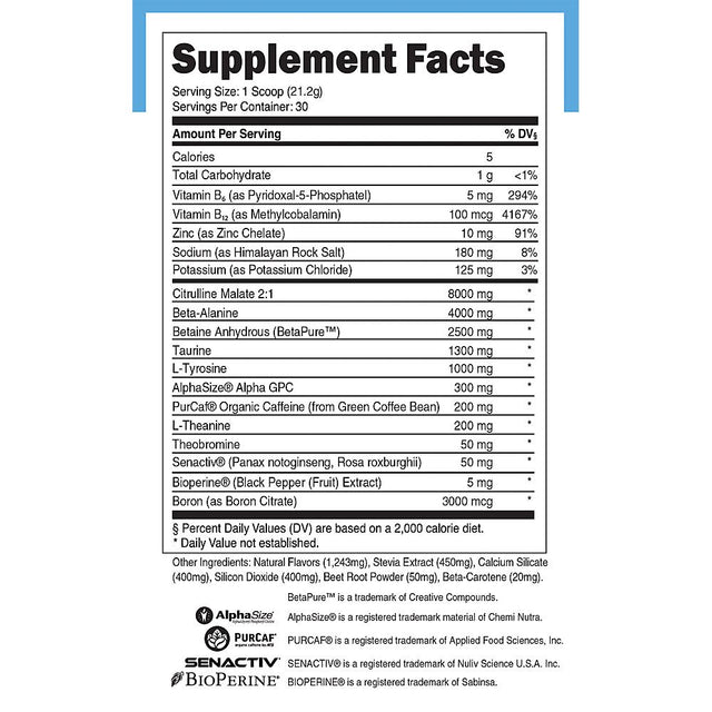 Citrulline malate is the “star child” of pre-workout science.We chose citrulline malate over L-arginine because it provides better absorption, higher plasma arginine levels, and has been found to: Improve strength, aerobic performance, and muscle endurance. Be at least twice as effective as L-arginine supplementation at raising nitric oxide. Enhance the use of branch chain amino acids like leucine during exercise.