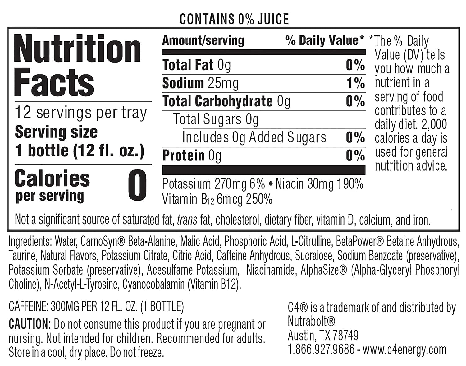 Fuel your ultimate this is not your typical energy drink. This is the ultimate, explosive, super-charged, no-holds-barred, bottle of domination, engineered for the Elite among us who demand nothing but results. Every bottle of C4 Ultimate non-carbonated is loaded with incredible flavors and the perfect amount of non-carbonation to kick-start your taste buds. Ultimate ingredients for ultimate domination C4 Ultimate non-carbonated is packed with a combination of clinically studied ingredients never before seen in a performance energy drink. Born from the legendary explosive energy, pumps, endurance, and focus found in C4 Ultimate, this high-intensity explosive energy formula delivers 300mg caffeine, Carnosine beta-alanine, and Alpha size A-GPC engineered to unlock the ultimate level of performance For the everyday grind.
