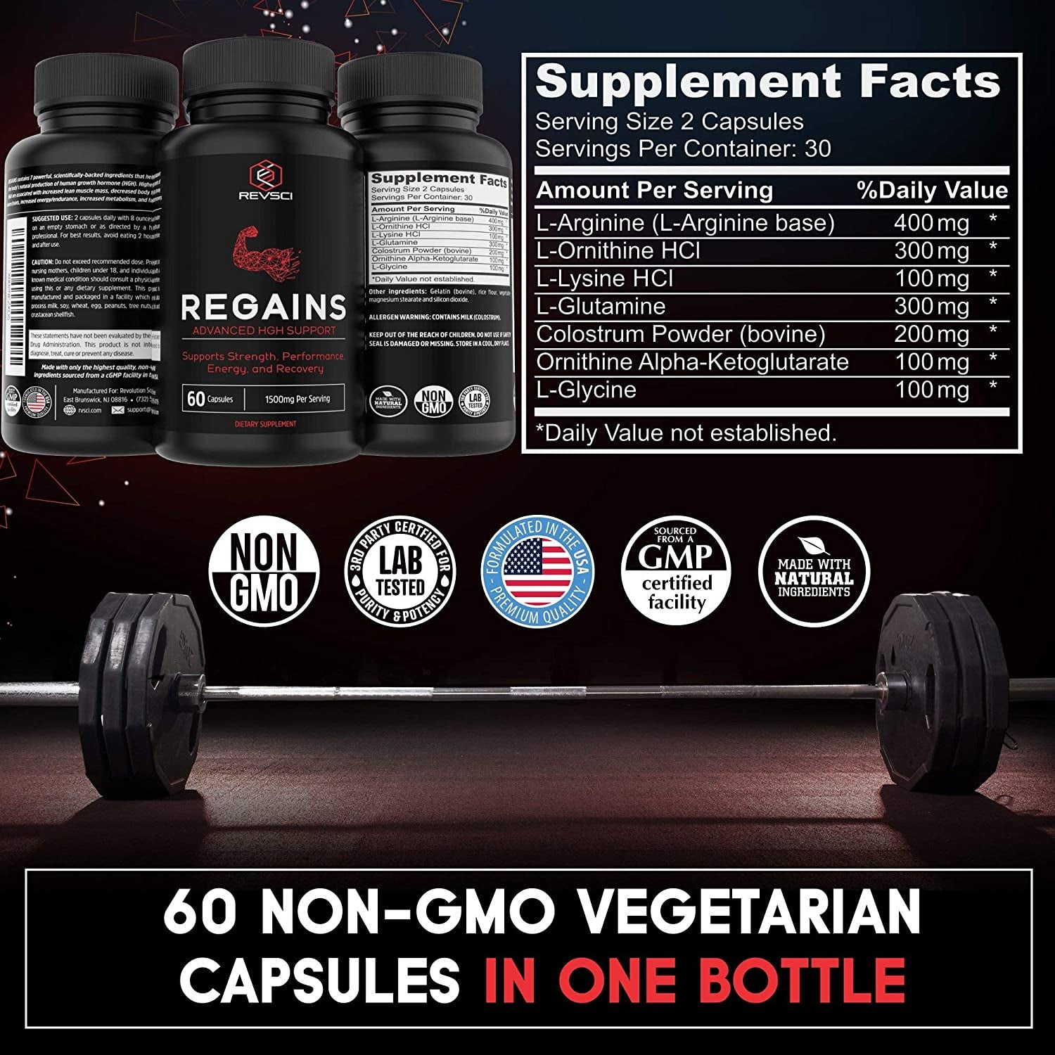 Regains is an all-natural blend of 6 amino acids + colostrum that improves the body's natural production of HGH.