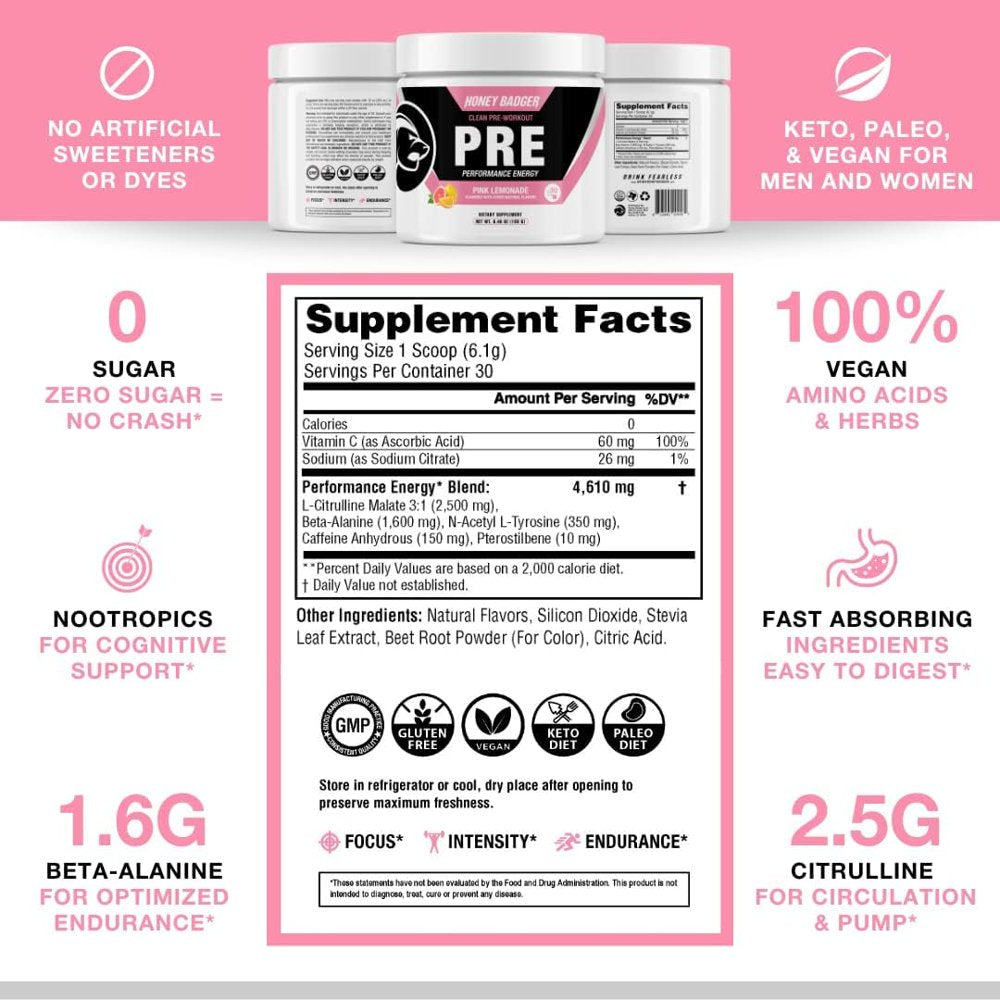 Honey Badger Pre Workout Powder, Keto Vegan Preworkout for Men & Women with Vitamin C for Immune Support, Beta Alanine & Caffeine, Sugar Free Natural Energy Supplement, Pink Lemonade, 30 Servings - Pink Lemonade is backordered and will ship as soon as it is back in stock.