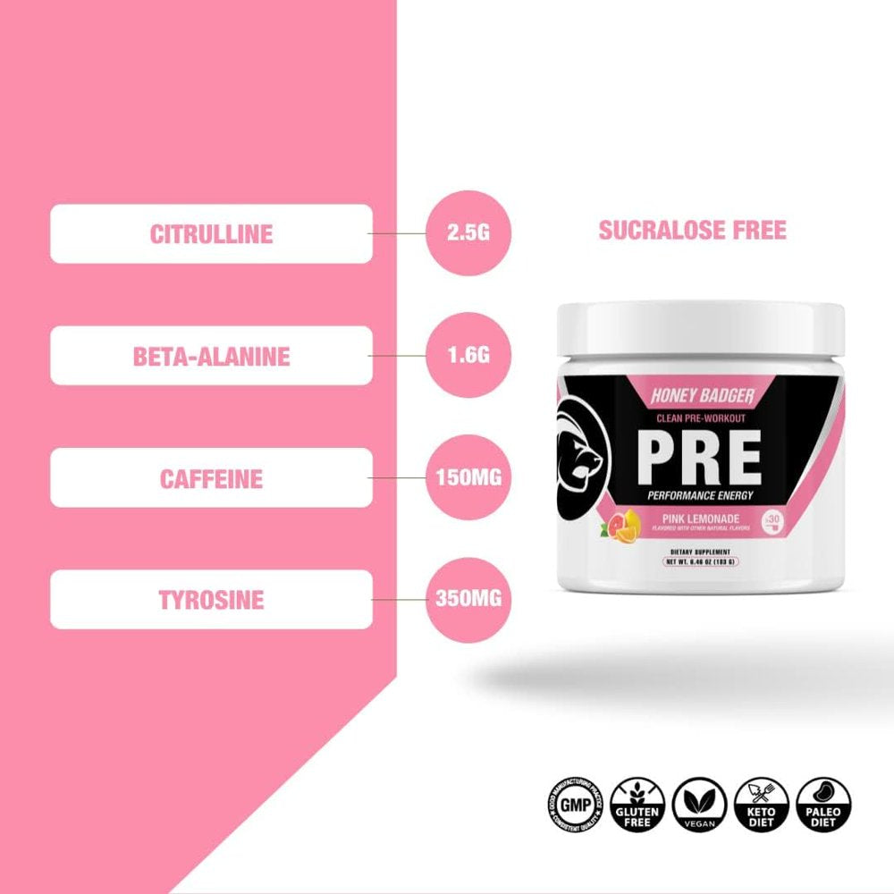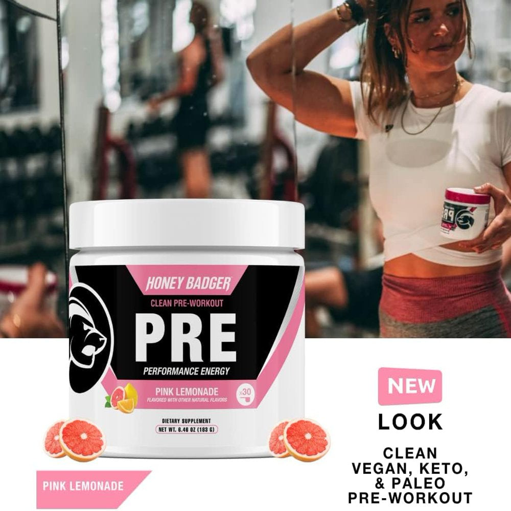 Honey Badger Pre Workout Powder, Keto Vegan Preworkout for Men & Women with Vitamin C for Immune Support, Beta Alanine & Caffeine, Sugar Free Natural Energy Supplement, Pink Lemonade, 30 Servings