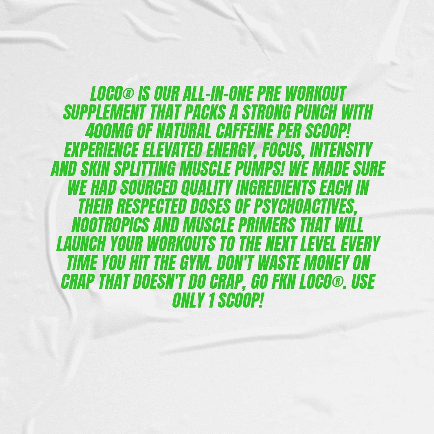 Sour Cherry ColaLOCO is our all-in-one pre-workout supplement that packs a strong punch with 400 mg of natural caffeine per scoop! | Lime SherbetWe made sure we had sourced quality ingredients each in their respected doses of neuroactives, nootropics and muscle primers that will launch your workouts to the next level every time you hit the gym. | Watermelon CandyExperience elevated energy, focus, intensity and skin splitting muscle pumps! |