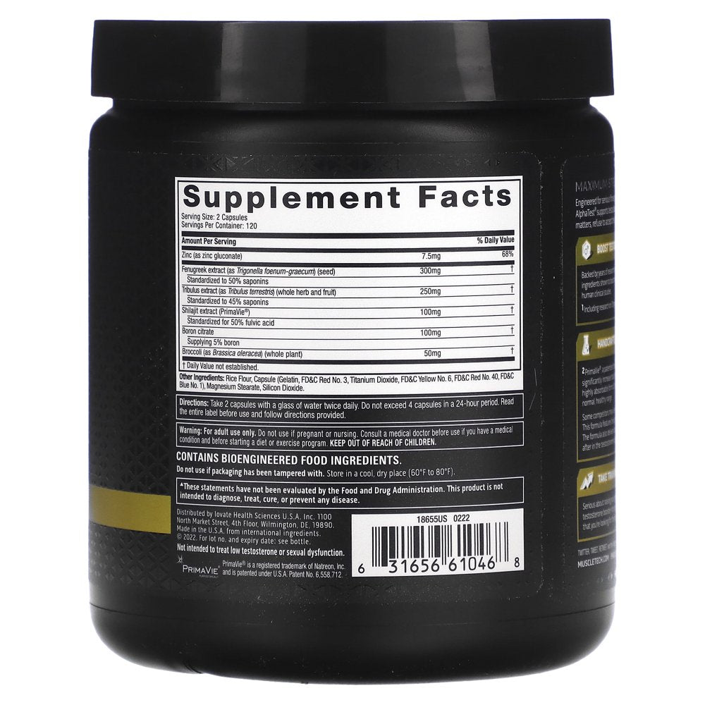 Boosts Testosterone in 7 Days¹ Increase Muscle Energy² Maximum-Strength Testosterone Booster 300 mg Fenugreek Extract‡ 100 mg Shilajit Extract‡ 100 mg Boron Citrate‡ 60 Day Supply Dietary Supplement Maximum-strength Testosterone-boosting Formula Engineered for serious fitness enthusiasts and performance athletes focused on maximizing strength and results. AlphaTest® supports testosterone production and will help take your training to the next level. When performance matters, refuse to accept the status quo and gain an added edge with the power of AlphaTest®! Boost Testosterone in just 7 Days Backed by years of research and development, AlphaTest® is engineered with full doses of scientifically validated key ingredients shown to boost testosterone levels and even combat estradiol. Each key ingredient is backed by separate human clinical studies. ¹Including research on 10mg of boron, shown to increase free testostone and decrease estradiol in just 7 days. Handcrafted Ingredient Combination ²PrimaVie®, a patented clinical-strength form of shilajit, has been shown to increase ATP levels in just 15 days and significantly increase total serum testosterone levels in 90 days. A precise dose of zinc gluconate - a premium, highly absorbable form of zinc - has been shown to help maintain optimal testosterone production within the normal, healthy range. Some competitors may use a lower standardization of fenugreek or not fully disclose the potency. Not AlphaTest®. This formula features fenugreek extract standardized to 50% saponins, giving you a potent, advanced compound. The formula also delivers broccoli powder, a source of diindolylmethane (DIM), which is another compound sought after in the testosterone category. Take Training to the Next Level Serious about raising your game and wanting to deliver when it matters most? Then you need to incorporate a testosterone booster into your regimen. With a fully disclosed formula and researched doses of coveted key ingredients that you're looking for, the robust AlphaTest® formula delivers results with just two daily servings. ‡Per serving
