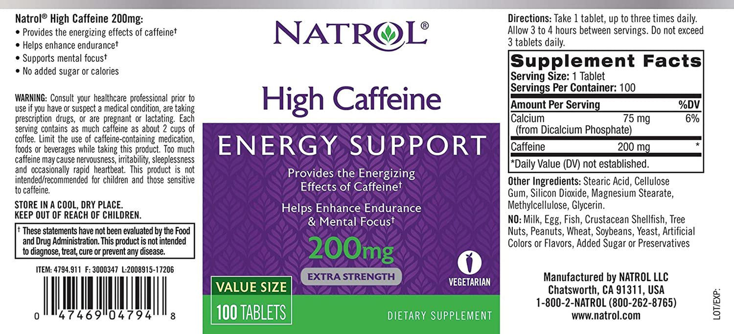 Packed with a safe dosage of 200mg of caffeine and no added sugar or calories, Natrol High Caffeine can help to increase mental focus and alertness and fight fatigue.* Caffeine acts as a stimulant to the central nervous system that wakes you up and provides the added energy boost and mental clarity to optimize efficiency while you work.* This product is exceptional as a daily supplement for pre-workout and improving mental clarity.* Natrol High Caffeine provides the energizing effects of caffeine, helping to enhance endurance and mental focus.* *These statements have not been evaluated by the Food and Drug Administration. This product is not intended to diagnose, treat, cure, or prevent any disease.