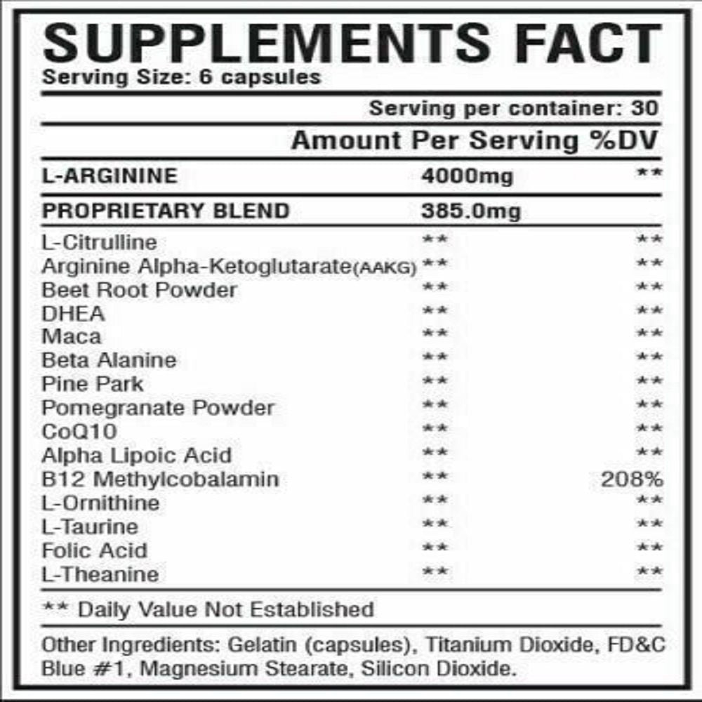 - Active Ingredients: L-Arginine, L-Citrulline, Arginine-alpha-ketoglutarate (AAKG)