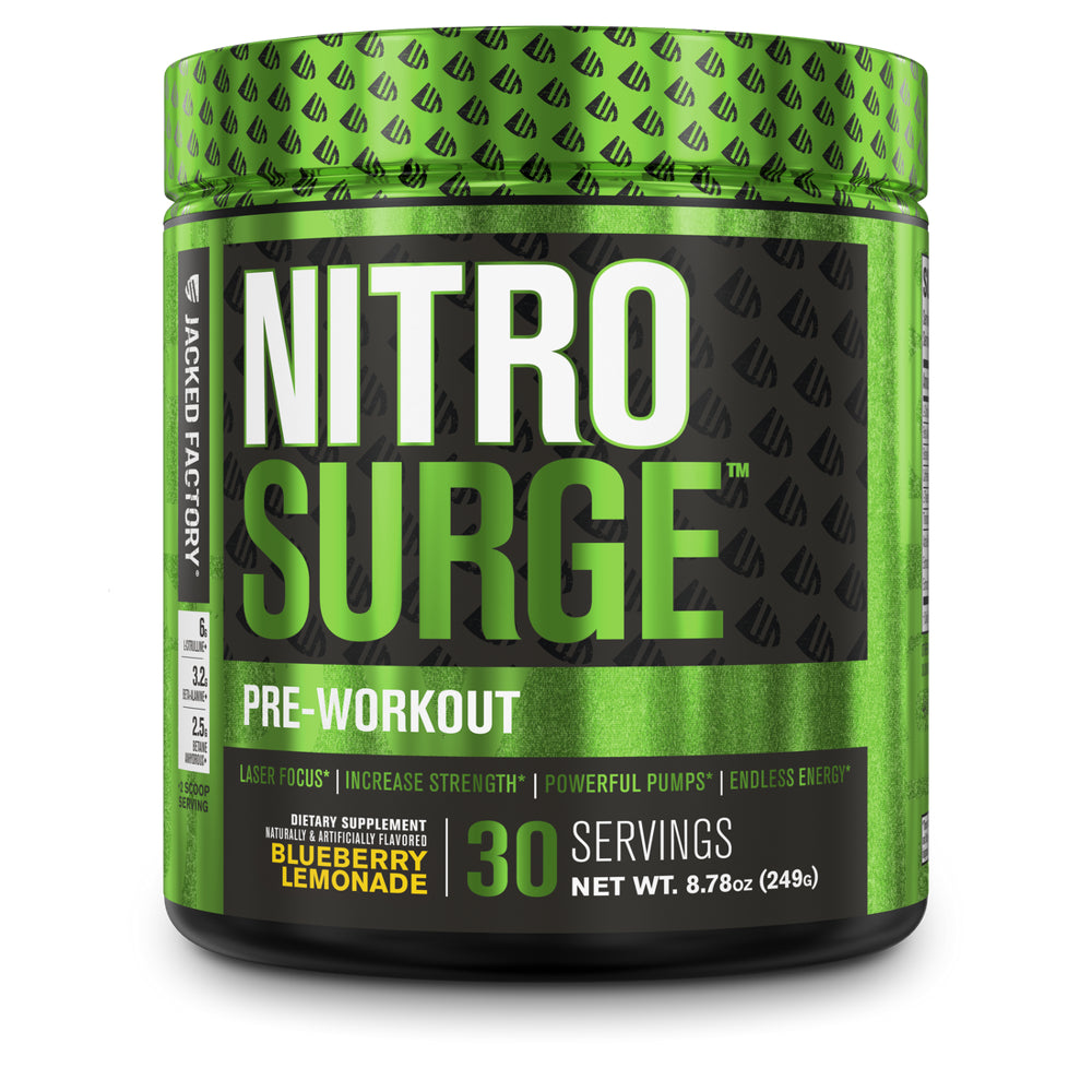 Nitrosurge preworkout is one of the highest rated pre workout supplements with unmatched versatility. We carefully crafted this energizing, sugar free pre workout powder with evidence-based ingredients like L-citrulline, beta-alanine, L-theanine, caffeine, and betaine anhydrous to help you crush your workouts every time you hit the gym. Rather than overloading your body with harsh stimulants, Nitrosurge provides science-backed ingredients that work together to increase nitric oxide, enhance energy, focus, blood flow, strength, endurance, and recovery to create an elite clean pre workout. All Jacked Factory products come with total label transparency so you know exactly what you’re getting. Each bottle of Nitrosurge pre-workout is manufactured in a state-of-the-art cGMP manufacturing facility in the USA adhering to the most stringent manufacturing standards.