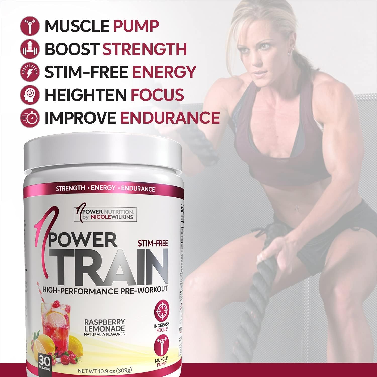 Npower Nutrition-Train Pre-Workout for Women, Raspberry Lemonade, 30 Servings, Stimulant Free, Increase Focus & Muscle Pumps