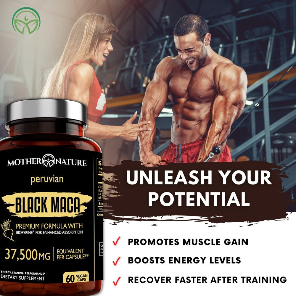 Elevate vitality with Black Maca Extra Strength by Mother Nature Organics. Each bottle packs 37,500mg of Black Maca per vegetarian capsule, a 60-day supply. It's Vegan/Vegetarian, Non-GMO, and Gluten-free with no fillers or artificial ingredients. Our 50:1 Organic Potent Extract boosts energy, fights fatigue, fortifies immunity, and supports metabolic health. Plus, it's your top choice for sexual health and performance. Discover maca's power for women and men, Nature's Endurance, Black Essence Maca, and more. Harness the excellence of Black Maca Root Pills and invigorate with Maca Coffee for men's energy. Supercharge your vitality with maca vitamins today!