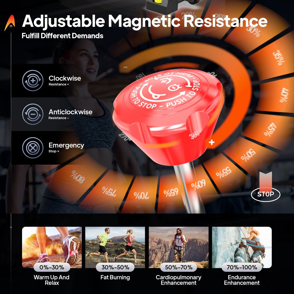 ULTRA SILENT MAGNETIC RESISTANCEï¼Built with tension control system, it is convenient for you to customize your workout tension levels for an easier or more difficult workout. Designed with ergonomic resistance, ensures smoother and ultra quieter workouts while cycling, no worry for disturbing others. Virtually no maintenance. Belt drive mechanism.
