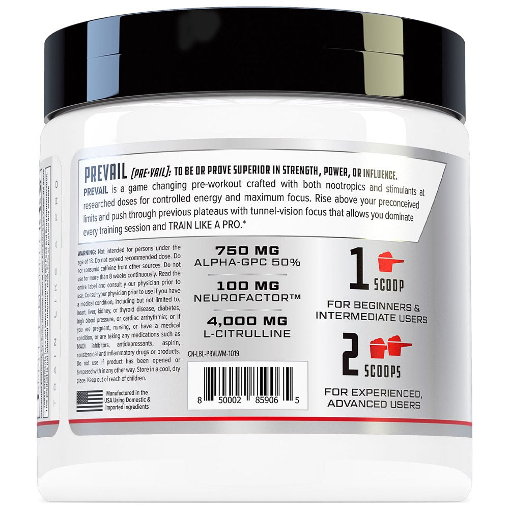 PREVAIL differs by not succumbing to the inferior strategy that other pre-workouts take by loading you up on caffeine and other stimulants at ridiculous dosages that either make your heart race or put you in a cold sweat. PREVAIL features a unique blend of stimulants and nootropics at researched doses for controlled energy and maximum focus.