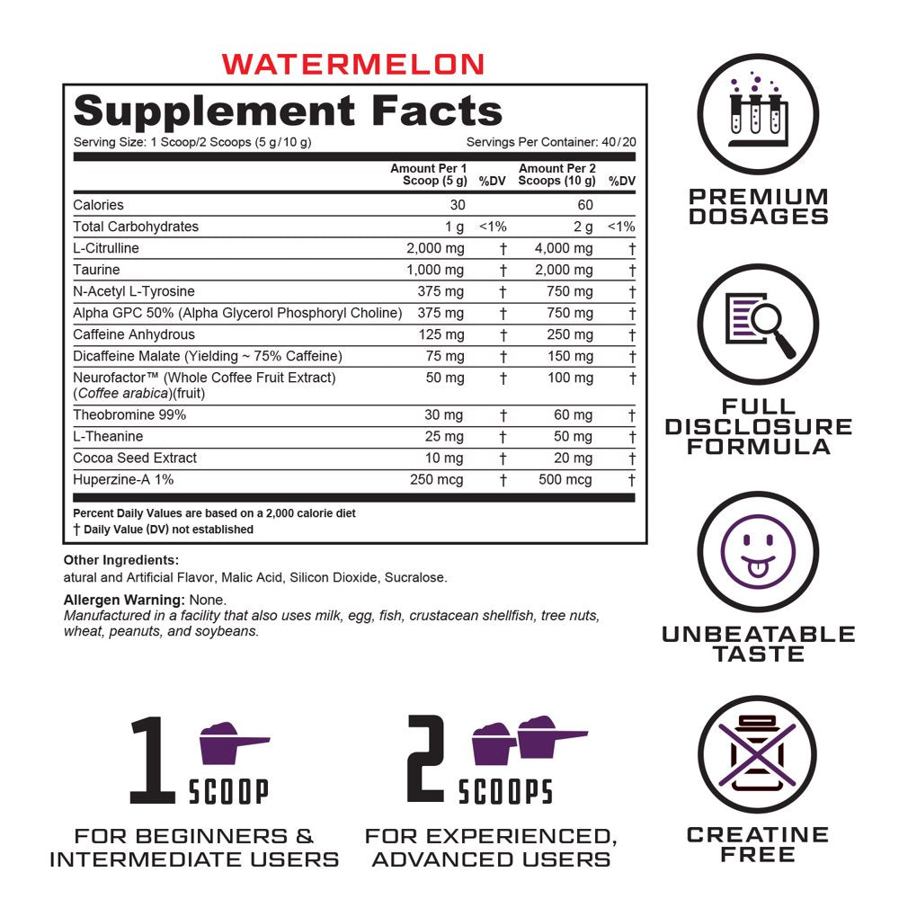 Prevail Preworkout for Energy Powder - Best Tasting Nootropic Pre Workout, Watermelon, 40 Servings - Intense Focus Supplement with L-Citrulline, Alpha-Gpc & L-Tyrosine