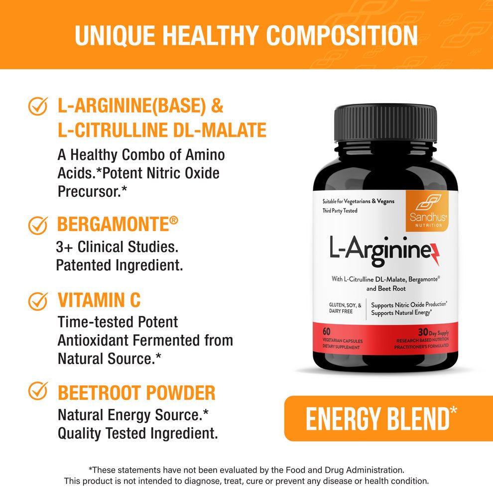 Discover Our Blend: Exercise causes amino acid oxidation in proportion to its intensity.* Net loss of muscle protein due to the intense workout cannot be balanced with the body’s natural amino acids.* L-Arginine is a semi-essential amino acid, it supports optimal energy level and protein synthesis.* This blend also supports healthy sports performance by Nitric Oxide formation.* Why to take L-Arginine Blend? Pumps Athletic Performance:* L-Arginine supports the construction of strong muscles and protein-building through anabolic reactions.* It also supports maintaining healthy stamina levels for better athletic performance and endurance.* Precursor to Nitric oxide:* A healthy combination of L-Citrulline DL-Malate and Beet Root Powder, acts as a precursor to Nitric Oxide.* It supports healthy blood flow and mitochondrial respiration for quick muscle recovery following intense workouts.* It also supports better absorption of amino acids to optimize energy levels.* Cardiac & Immune Health:* Our unique blend includes clinically tested ingredient Bergamonte® (38% Polyphenolic Flavones) to support healthy cardiovascular functioning by maintaining healthy cholesterol and blood glucose levels.* Vitamin-C is also added to this blend and acts as an additional support for healthy vascular elasticity and healthy immune function.*