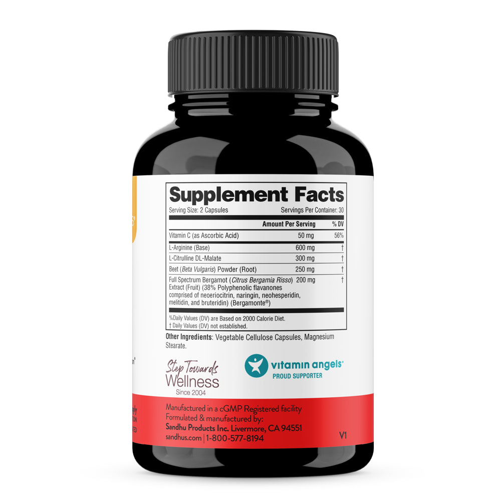 - Sandhu’s Nitric Oxide supplement – Sandhu’s L-Arginine with L-Citrulline DL malate, beetroot powder, vitamin C, and Bergamonte® is an energy supplement, manufactured, packed, tested, and distributed in the USA according to strict cGMP norms, offering 30 servings per bottle.