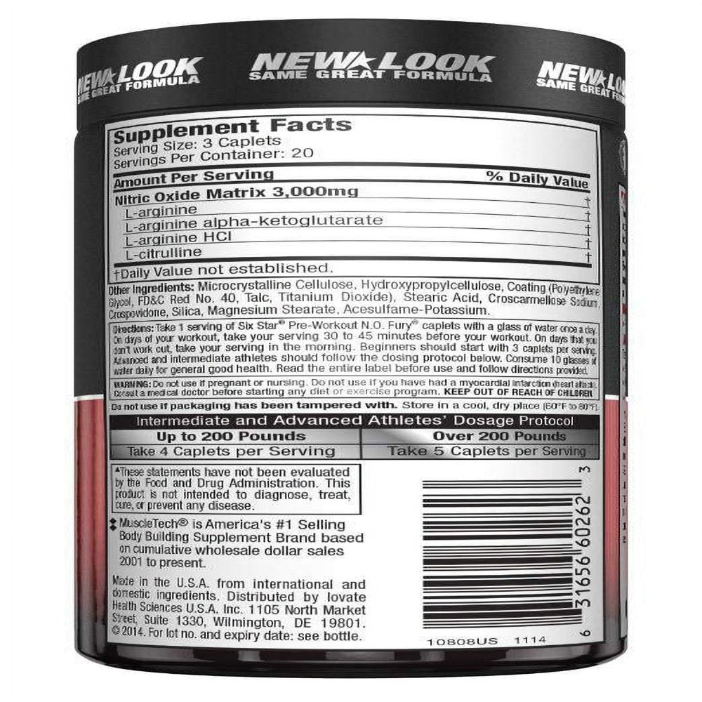- Six Star N.O. Fury caplets flood your system with pre workout ingredients after the first dose enhancing nitric oxide levels to elicit rapid vascular expansion