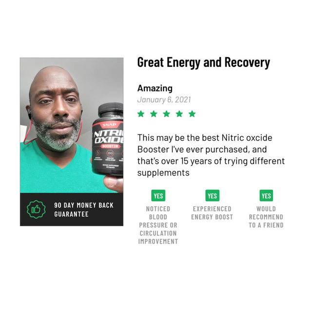 Nitric Oxide Booster for supporting blood pressure and helping circulation. Help reduce risks of cardiovascular diseases by supplementing your body naturally. When you restore your body’s natural supply of nitric oxide you give your cardiovascular system the tools it needs to perform at its peak each day. Don’t let poor circulation or high blood pressure keep you from fully experiencing everything life has to offer. Try Nitric Oxide Booster today! Nitric Oxide Booster by Snap Supplements - Pre Workout, Muscle Builder - L Arginine, L Citrulline 1500mg Formula, Tribulus Extract & Panax Ginseng, Strength & Endurance. When you restore your body’s natural supply of nitric oxide you give your cardiovascular system the tools it needs to perform at its peak each day. Don’t let poor limitations keep you from fully experiencing everything life has to offer. Try Nitric Oxide Booster today!