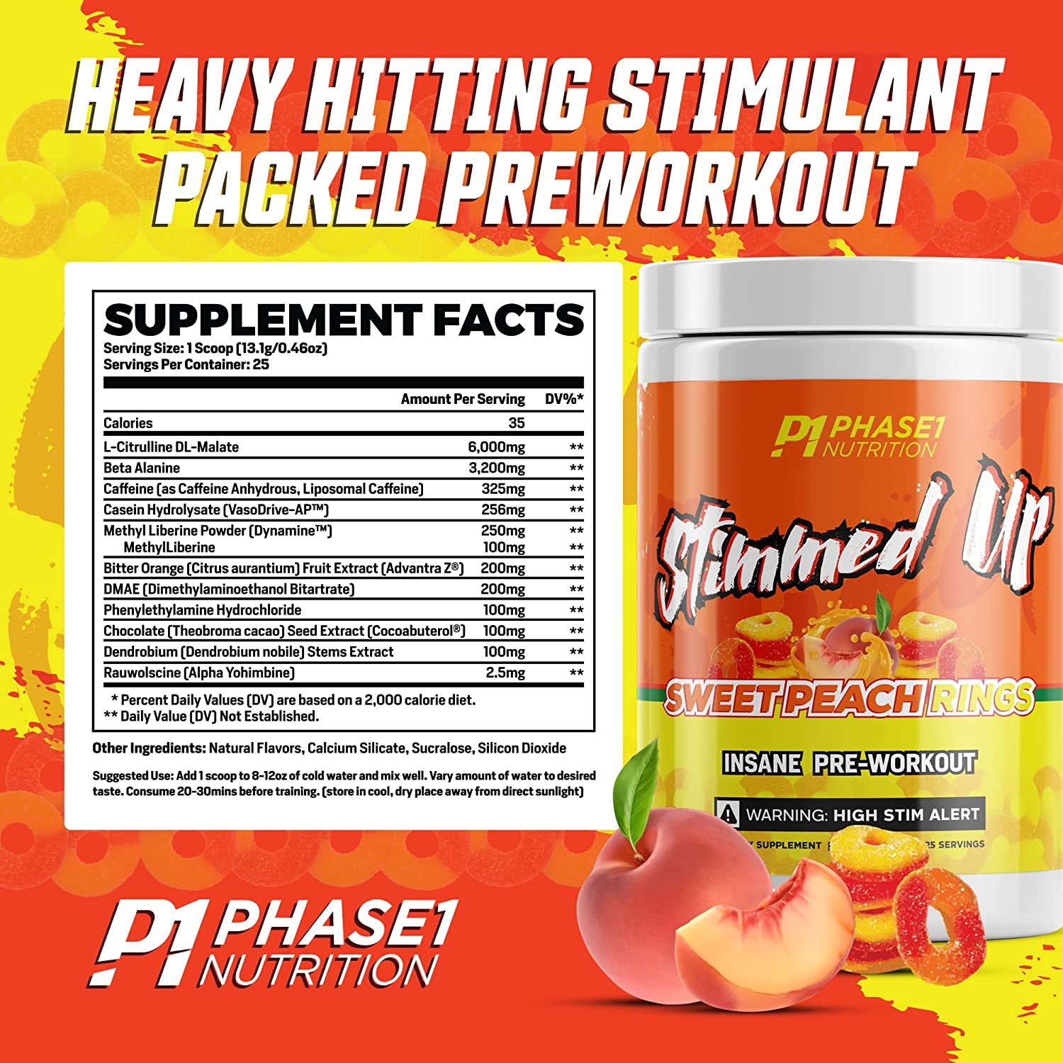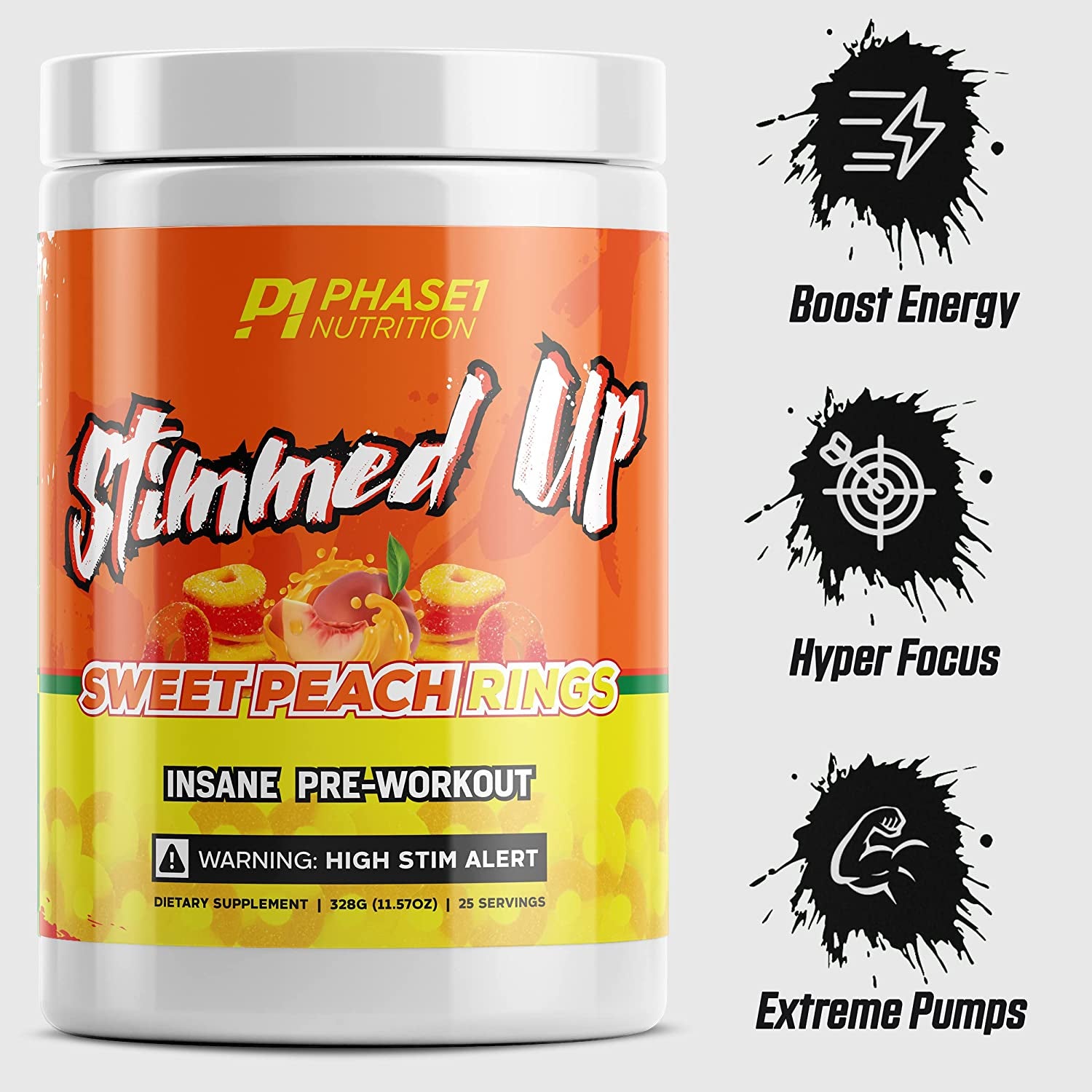 - NEXT LEVEL WORKOUTS – Take Your Workout to the Next Level! Unleash your full potential! Stimmed Up – High Stim Pre Workout by Phase 1 is fueled by extremely powerful and intense energy boosters. It is the highest power pre-workout supplement for Active Individuals. With a unique blend of stimulants that boosts energy, increases mental focus, and allows extreme muscle contraction capacity, this high stim preworkout helps you train harder with consistent surge of energy for longer periods!