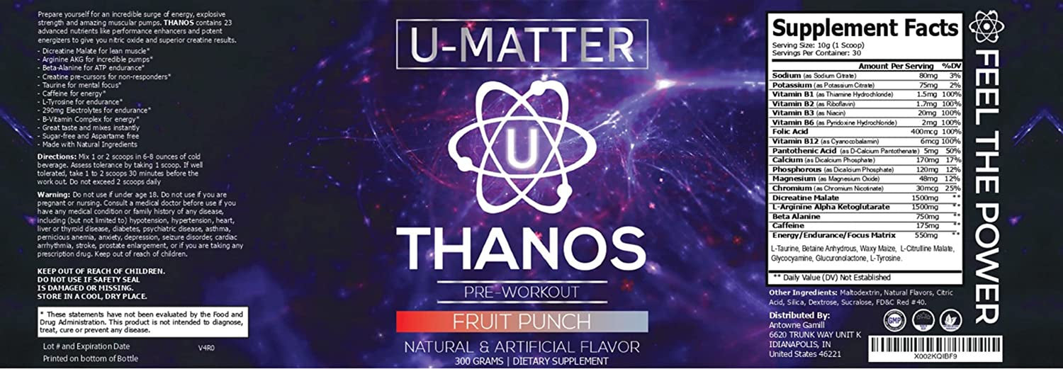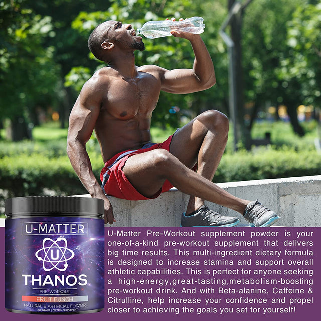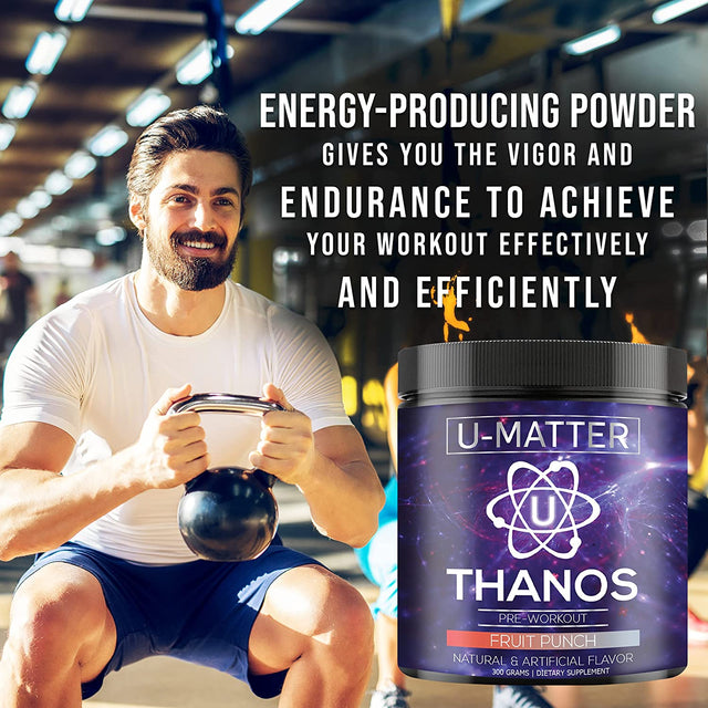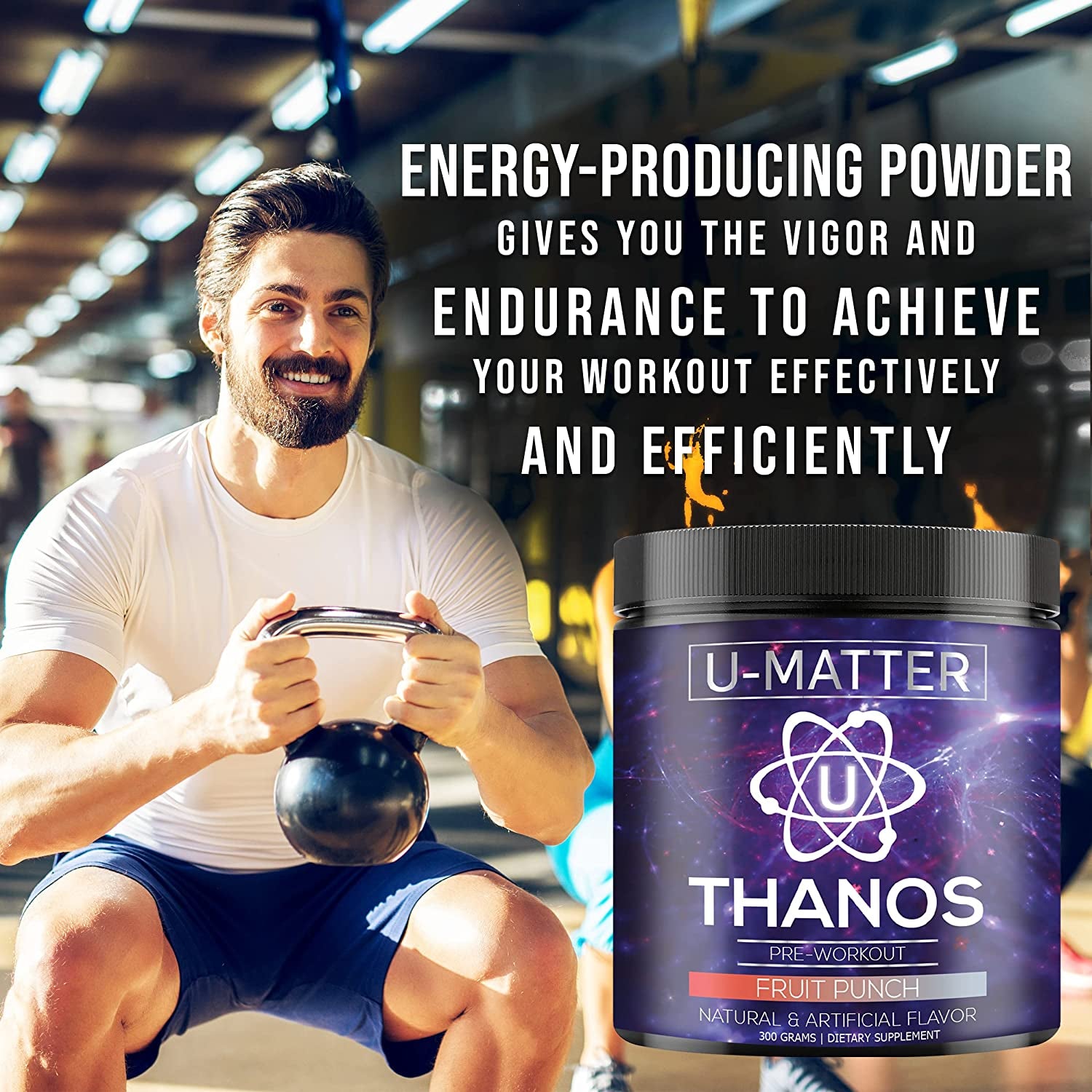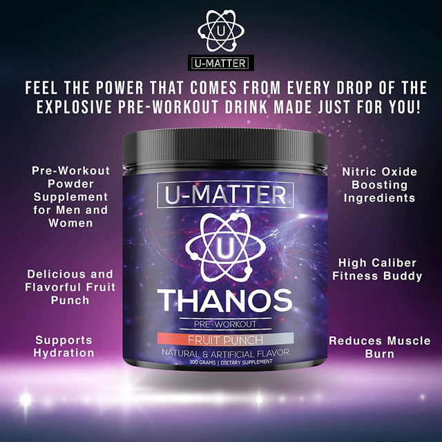 - 💪 Pre-Workout Powder Supplement for Men and Women - Whether you’re a regular at the gym or stick to at-home workouts, U-Matter Thanos Pre-Workout Powder is here to fuel your body with the right nutrients prior to your exercise! This pre-workout supplement is developed to increase your body’s stored supply of necessary compounds to improve recovery time, muscle mass, and strength. This multi-ingredient dietary formula is designed to increase stamina and support overall athletic capabilities.