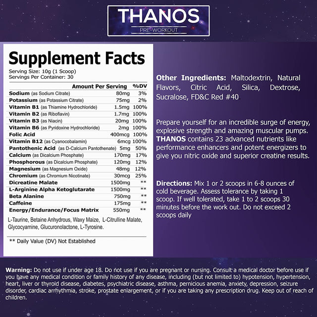 Thanos Pre-Workout Powder | Includes L-Taurine, Betaine Anhydrous, L-Arginine, L-Citrulline Malate & L-Tyrosine | Fruit Punch Flavored Preworkout | Energy Boost, Pump, & Focus - 30 Servings is backordered and will ship as soon as it is back in stock.