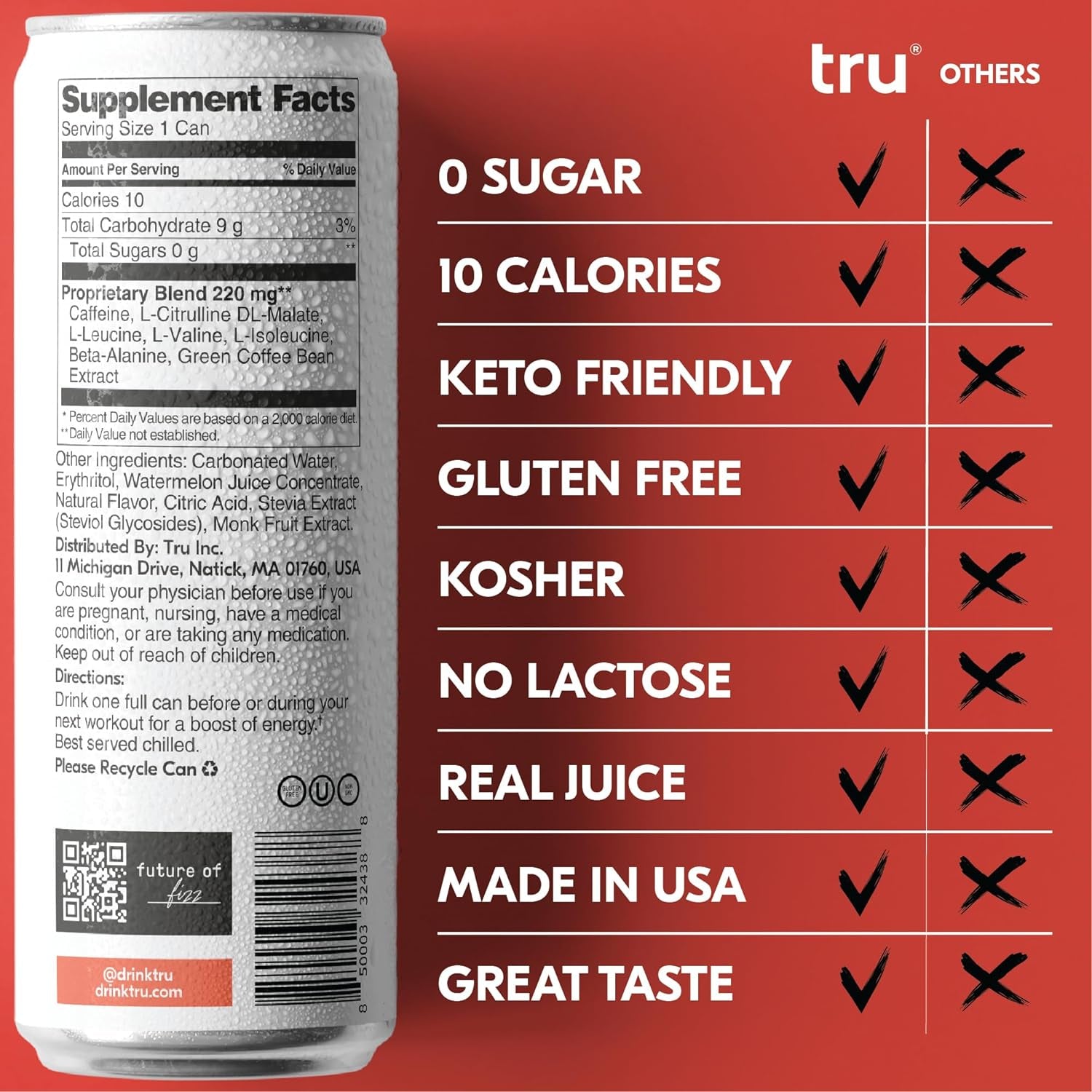 Tru Power Seltzer, Watermelon Flavored Sparkling Water Made with Real Fruit Juice - Pre Workout Drink plus Amino Acids - Natural Caffeine, Kosher, GF, No Added Sugar Beverages, 12Oz (Pack of 12)