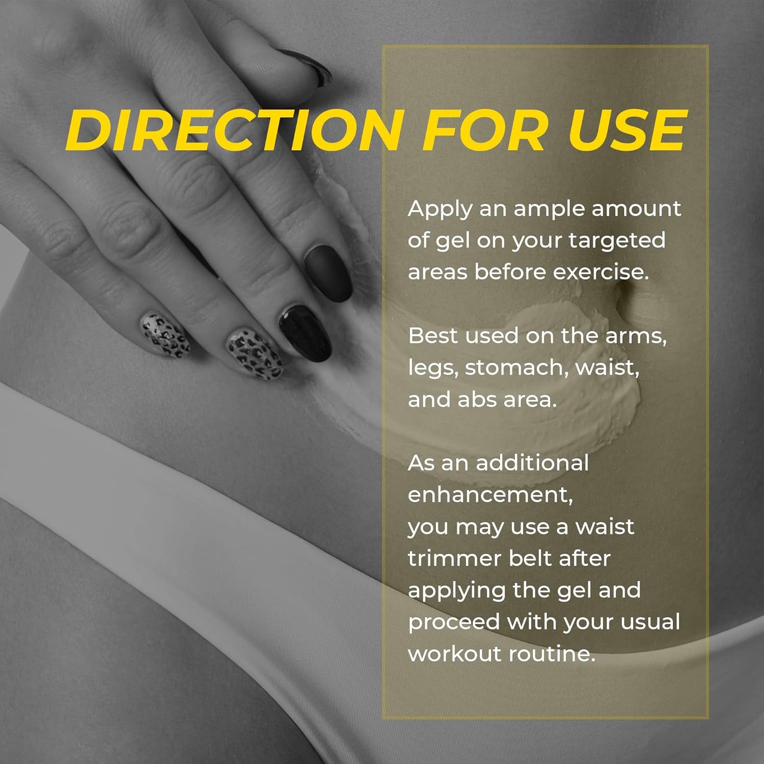- Slimming, Toning, & Fat Burning - Our product focuses on slimming your waistline, toning and enhancing your thigh and butt muscles, and burning those fats that men and women hate to see in most areas of our body. This wonderful gel works on the targeted areas when applied before going through your workout to increase sweat production and promote faster fat burning effect.