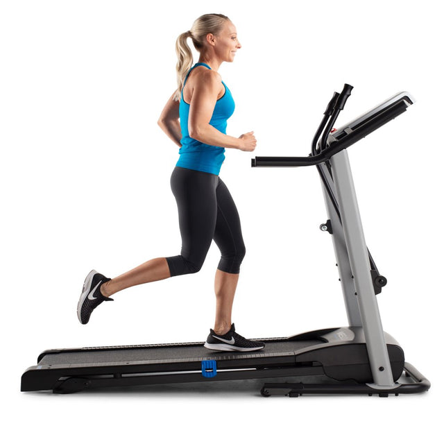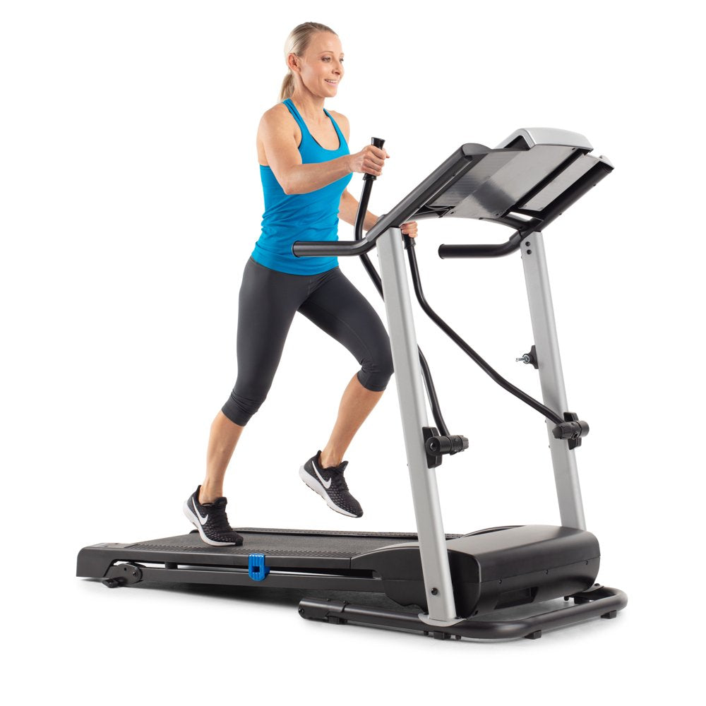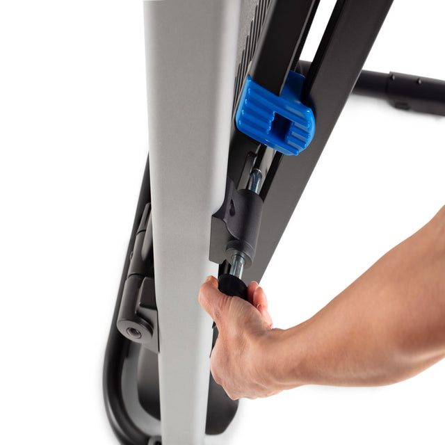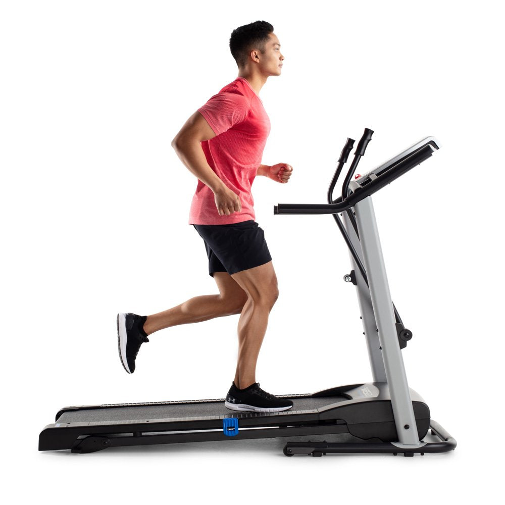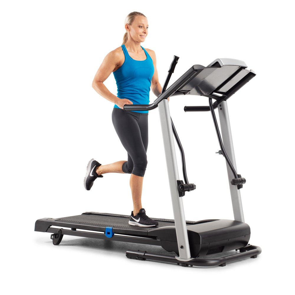 Get a total body workout on the Weslo CrossWalk 5.2t Folding Treadmill. A Bluetooth smart connection makes it easy to connect to your iFIT account (sold separately). Turn your treadmill into the ultimate fitness companion. Experience the difference that in-home personal training can make. Choosing your favorite coach to lead you towards success. Travel across the world for an exhilarating at-home workout experience. Participate in virtual studio classes led by charismatic trainers. Enjoy personalized fitness and diet tips and daily suggested workouts, all from the comfort of home. Burn extra calories and tone your arms with integrated CrossWalk Upper Body Resistance Arms. Easily adjust your machine’s manual incline to add a level of difficulty to your training. Comfort cell cushioning protects your joints as you run, making for a more enjoyable exercise experience. An Impulse motor provides a reliable ride with every step. When you are done working out, use your machine’s innovative SpaceSaver design to fold your tread deck up and out of the way.