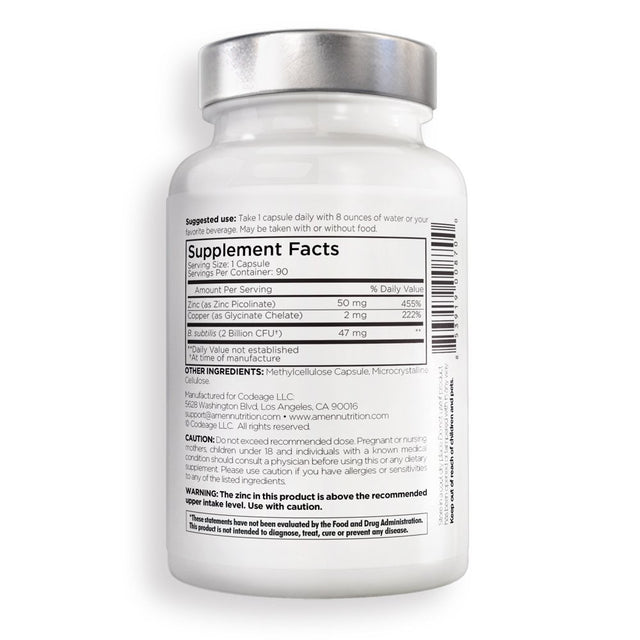 • Probiotics to Elevate the Formula: Amen Zinc vitamins + Copper formula also adds 2 billion CFUs* of Probiotics with B. Subtilis strain. Amen formula features zinc, copper and probiotics supplements all-in-one.